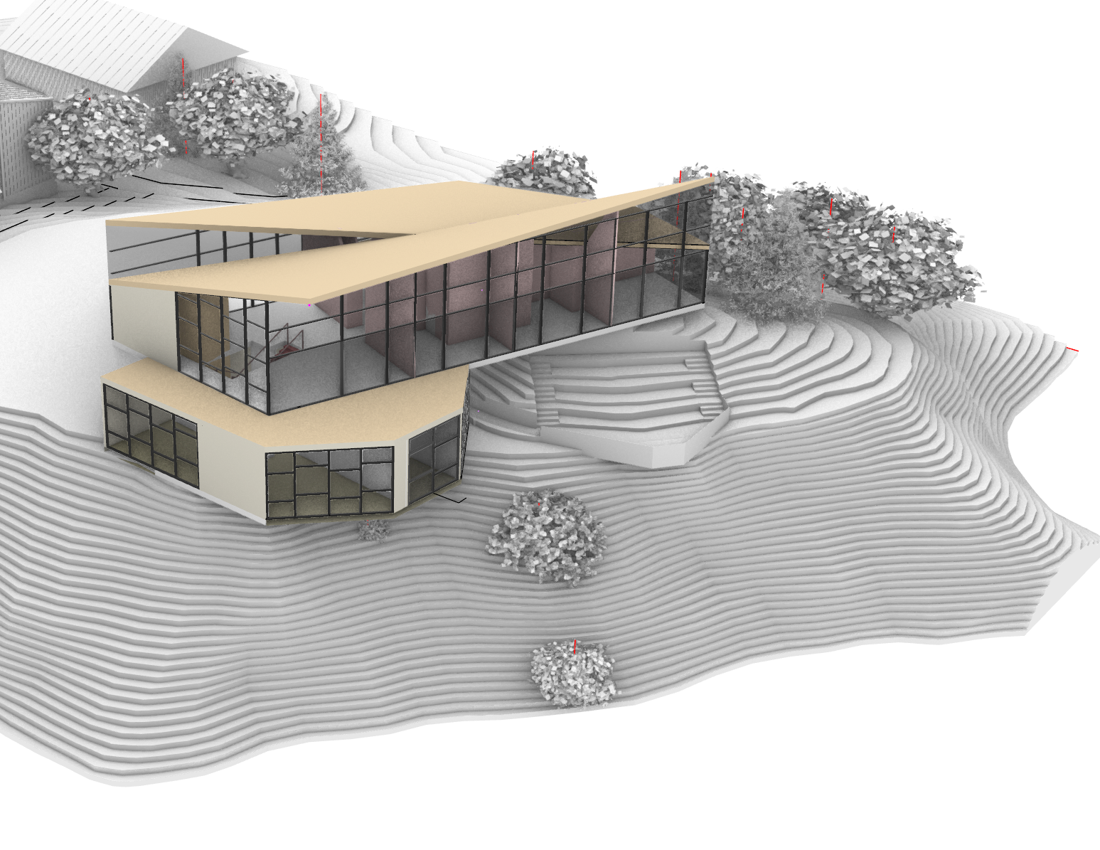 architectural watercolor rendering of a small contemporary research station perched on a rocky cliff structure made of warm wood black steel and glass precise and realistic architectural detailing cantilevered over stone terrain supported by steel beams surrounded by mountain pines and mist below rendered with crisp building geometry and realistic materials background and edges dissolve into loose watercolor washes and white paper edges not full bleed with soft unfinished fade around the image visible pencil and ink linework with light technical annotations artistic yet grounded balance of precision and painterly abstraction calm morning light concept architectural visualization style