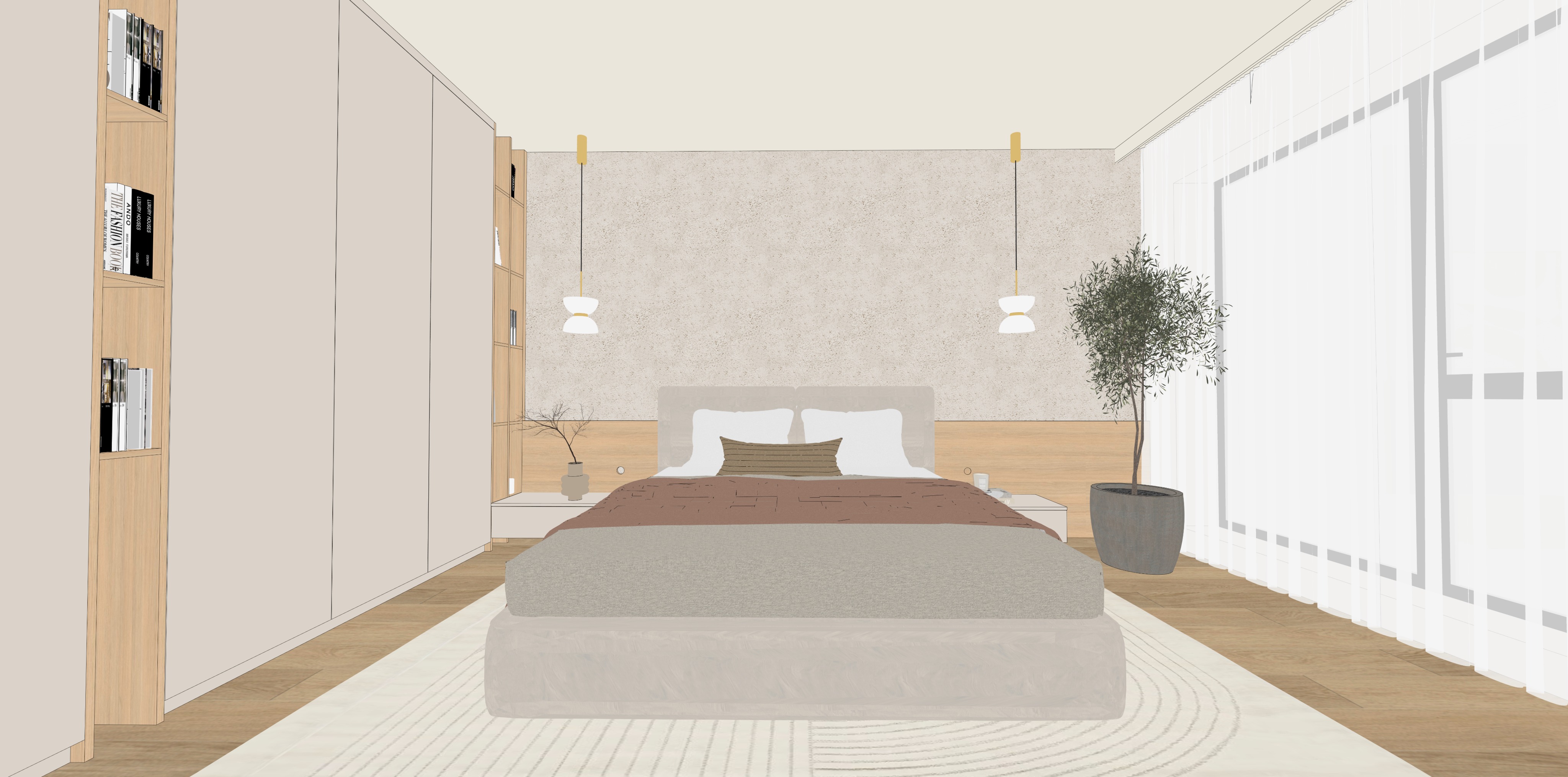 act as a world class architectural visualizer and 3d max corona render master i am providing an image of a 3d bedroom scene taken from a side viewpoint i need you to generate an ultra photorealistic architectural render based exactly on this geometry and layout critical instructions do not change the geometry layout or furniture placement this side view is crucial keep the curved black wall panel on the far left the open white door with its silver handle the cream wardrobes and the central open wooden shelving unit maintain all textures the light birch wood the cream colored wardrobes the specific beige textured upper wall paint the light wood flooring and the textures of the textiles the beige upholstery of the bed the brown blanket the cream linens new lighting to integrate crucial add a soft warm led strip light 3000k integrated behind the horizontal wooden panel behind the floating nightstand casting a beautiful realistic indirect light upwards onto the textured beige wall above it add a warm integrated led strip light within the vertical open wooden bookshelf the central one softly illuminating the books and shelves from within maintain the one visible pendant light as a soft warm light source scene description to reinforce the geometry a side view of a modern minimalist bedroom on the far left a curved black wall panel a white door is partially open next to it floor to ceiling cream wardrobes flanking a central vertical open light wood bookshelf filled with books to the right a horizontal light wood panel extends supporting a minimalist white floating nightstand with a small textured vase holding dried branches above it is the upper textured beige wall and one minimalist white and gold pendant light the foreground shows the side edge of the upholstered bed with its linen sheets and brown throw and the corner of the geometric patterned rug on the light wood floor diffused natural daylight enters from a unseen window to the far right style quality ultra photorealistic indistinguishable from a real photograph archdaily architectural photography style 8k resolution cinematic lighting sharp focus on textures the new warm led accents should be subtle and elegant creating a sophisticated ambiance rendered with the detail of a seasoned corona master showcasing precise micro shadows and material realism