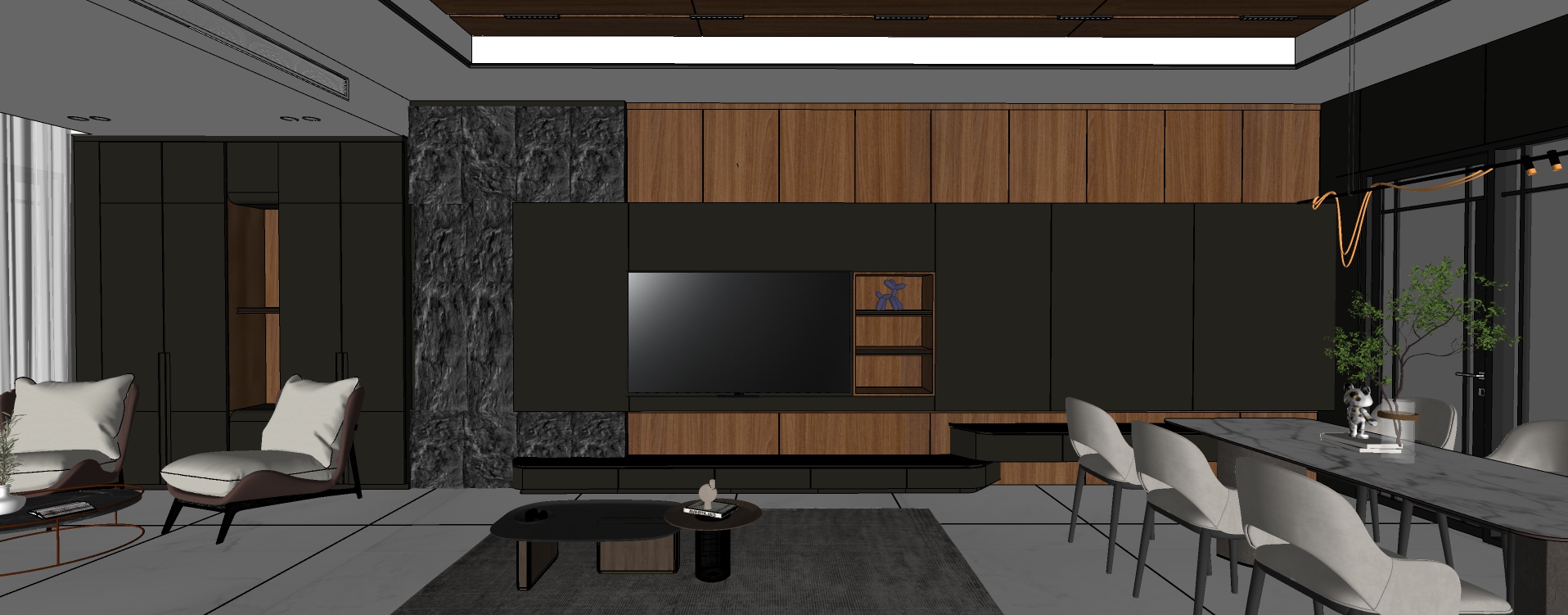 create an ultra realistic image without changing any of the structure shape design or materials dont resize the jpeg use soft white marble texture for the floor don t change the color material or shape add spotlights to the ceiling add indirect light to shelves and add some decorations add indirect light all around tv panel and do not change the material and colors