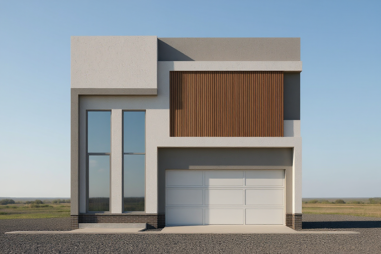 industrial building facade from reflective corrugated aluminium cladding light behind the windows field with lots of flowers and high grass in front screen at dusk sky gradient from bottom blue to top orange no changes to geometry or composition of image