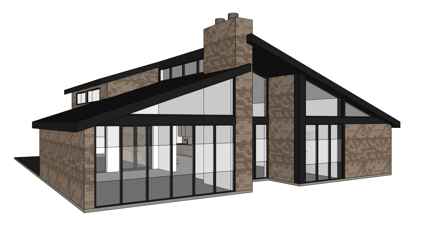 modern and minimalist architectural villa with large windows modern natural bricks large living room with fireplace surrounded by nature and forest cozy nature trail leading up to the house s main entrance in the middle