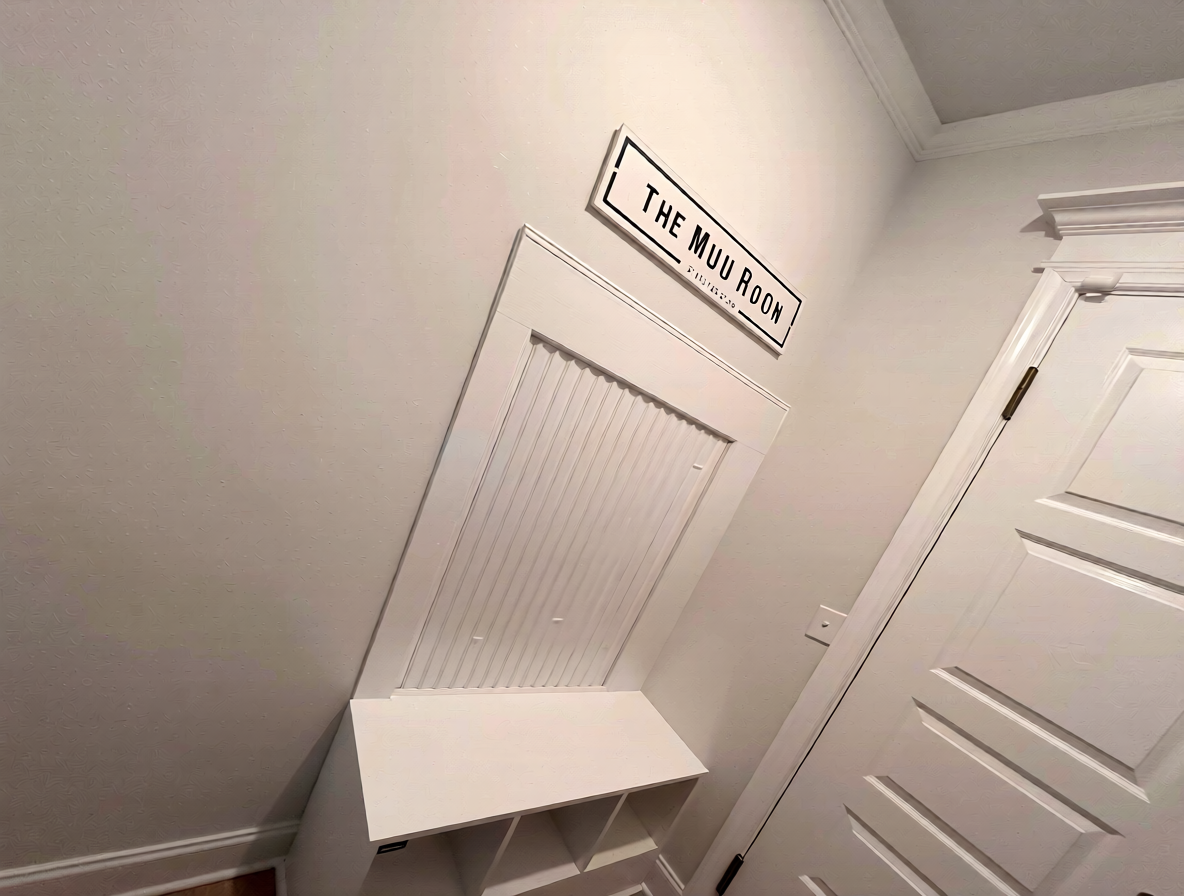 please add a tall cabinet to the left handside of the bench in a navy color and as deep as the bench where you see the sign that says the mud room replace that with a horizontal wall cabinet also in navy blue paint the existing backing and bench the same color add whicker baskets in the three holes of the bench
