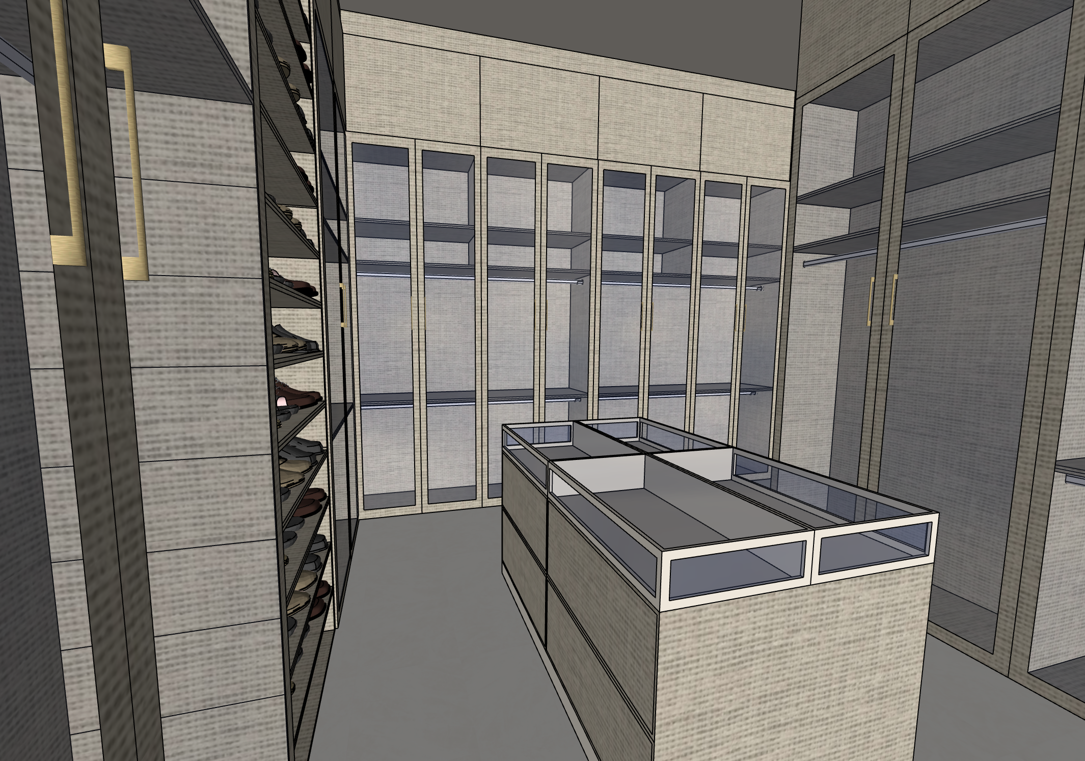 render a luxurious walk in closet featuring sleek modern cabinetry with a light beige finish incorporate glass doors with subtle reflections creating a sense of openness use warm ambient lighting to evoke a cozy and inviting atmosphere the floor should be a smooth matte ivory tile add brass handles for a touch of sophistication the overall vibe should be elegant and serene with a focus on luxury and organization