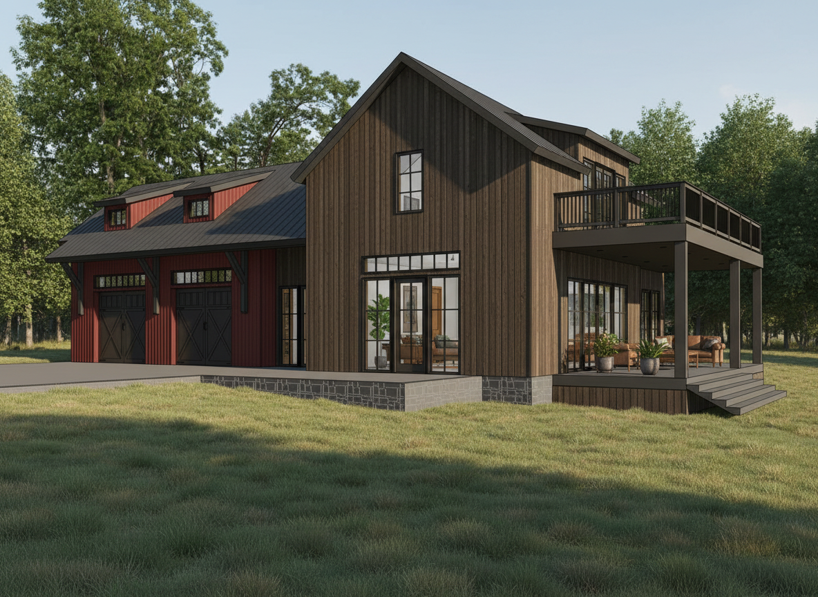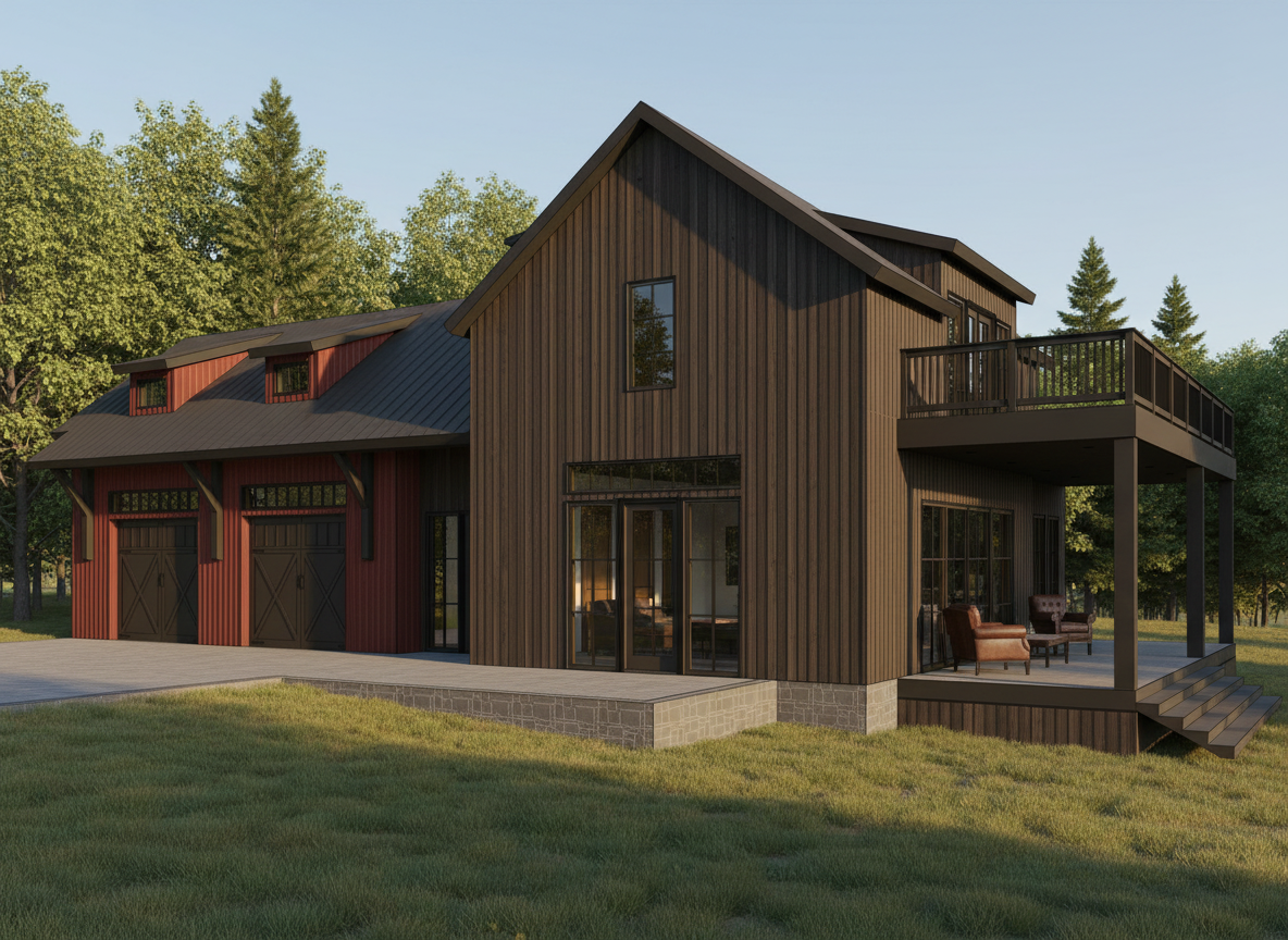 do not change the building shape or details use red vertical wood strip siding for the red shaded walls and utilize dark brown vertical wood strip siding for the right half of the building place the building near a tree line in a short grass field that is gently sloping down left to right make all the interior walls and doors an alabaster color and add comfortable wood and leather furnishings inside the building add comfortable and contemporary outdoor furnishings on the porch below the raised deck darken the interior and add smoke tint to the glazing add soft blue sky with minimal clouds and warm diffuse light