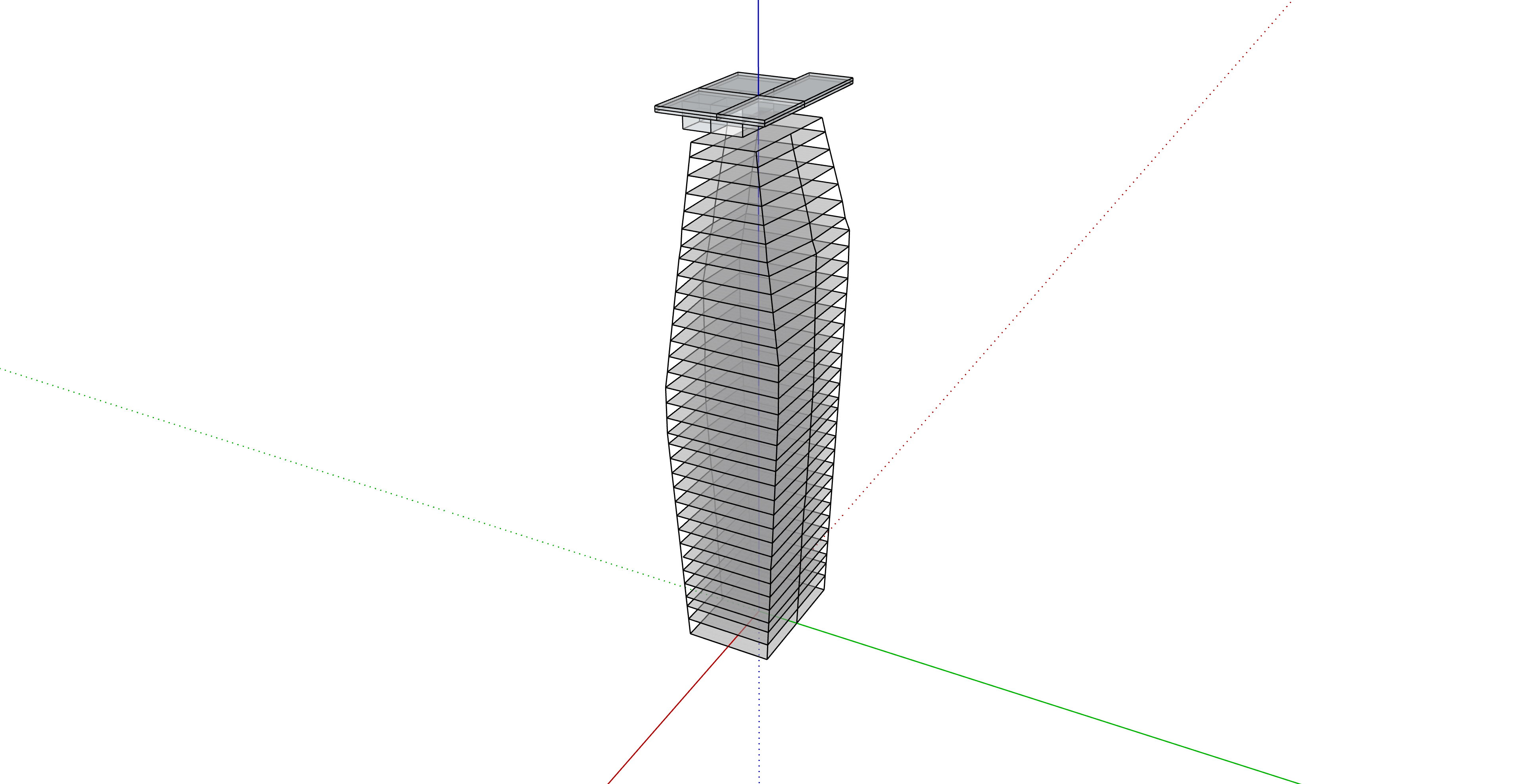render into a smooth edged glass building with a colored wrap pattern going up the sides with balconies