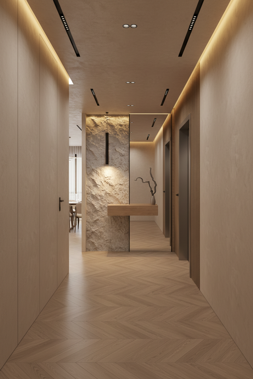use the uploaded model image as the base strict rule retain all geometry proportions materials colours lighting and camera angle exactly as shown do not redesign or restyle only apply the following corrections corrections door handle move the door handle to align correctly with the visible door outline on the left wall lift position and size make the lift smaller and position it closer to the feature wall remove incorrect door remove the door between the feature wall and the lift there is no door in this location right wall stair landing condition after the lift create a gap opening no continuous wall this gap represents a stair landing coming up from basement then show a separate wall continuing inward after the gap finished in french wash ensure the right hand wall is not continuous it breaks at the lift then resumes after the opening continuing in the french wash material ceiling lighting fixes remove all black track lights from the ceiling keep only downlights downlight layout arrange in two pairs only 4 total lights each pair is aligned one behind the other not side by side leave a slightly larger gap between the two pairs mirror reflection simplify reflection show only a single wooden entrance door keep it minimal no extra detail or additional elements final instruction keep everything else exactly the same as the original model materials textures lighting warmth feature wall mirror flooring etc do not introduce new design elements