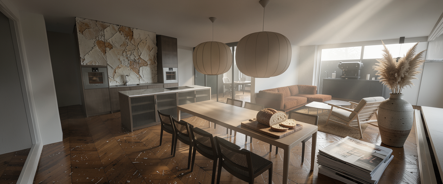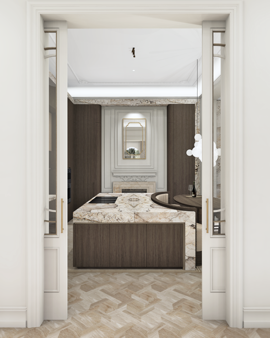enhance this image to ultra photorealistic quality preserve the exact geometry proportions layout materials colors textures and all design details exactly as shown do not add remove redesign restyle or reinterpret anything do not change materials colors lighting direction furniture dimensions or composition no new objects no decorative additions no artistic reinterpretation only improve realistic lighting natural shadows material realism true to life surface rendering reflections depth and camera realism high end architectural photography quality the final image must be a 1 1 faithful photorealistic version of the original design the floor can be a tiny tiny tiny bit darker and the island can have light doors in stead of wood