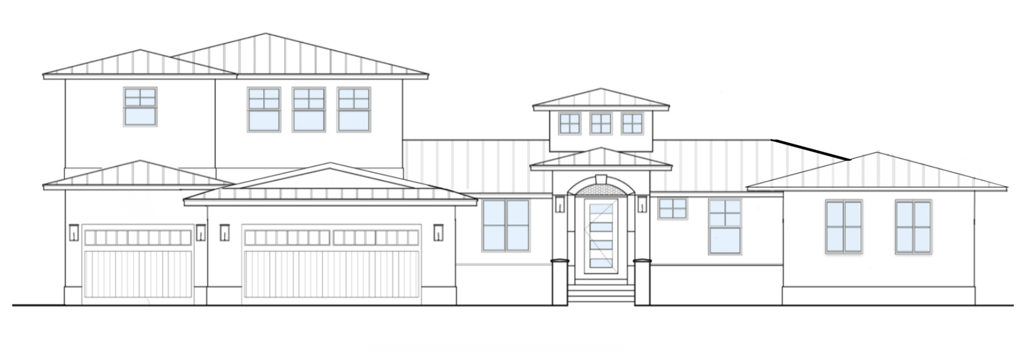 exterior shot house color should be ivory smooth stucco roof should be metal and light brown garage doors should be bermuda shutter style and ivory add brown wood bermuda style shutter awnings to four windows on left side of house and on two windows on right side of house