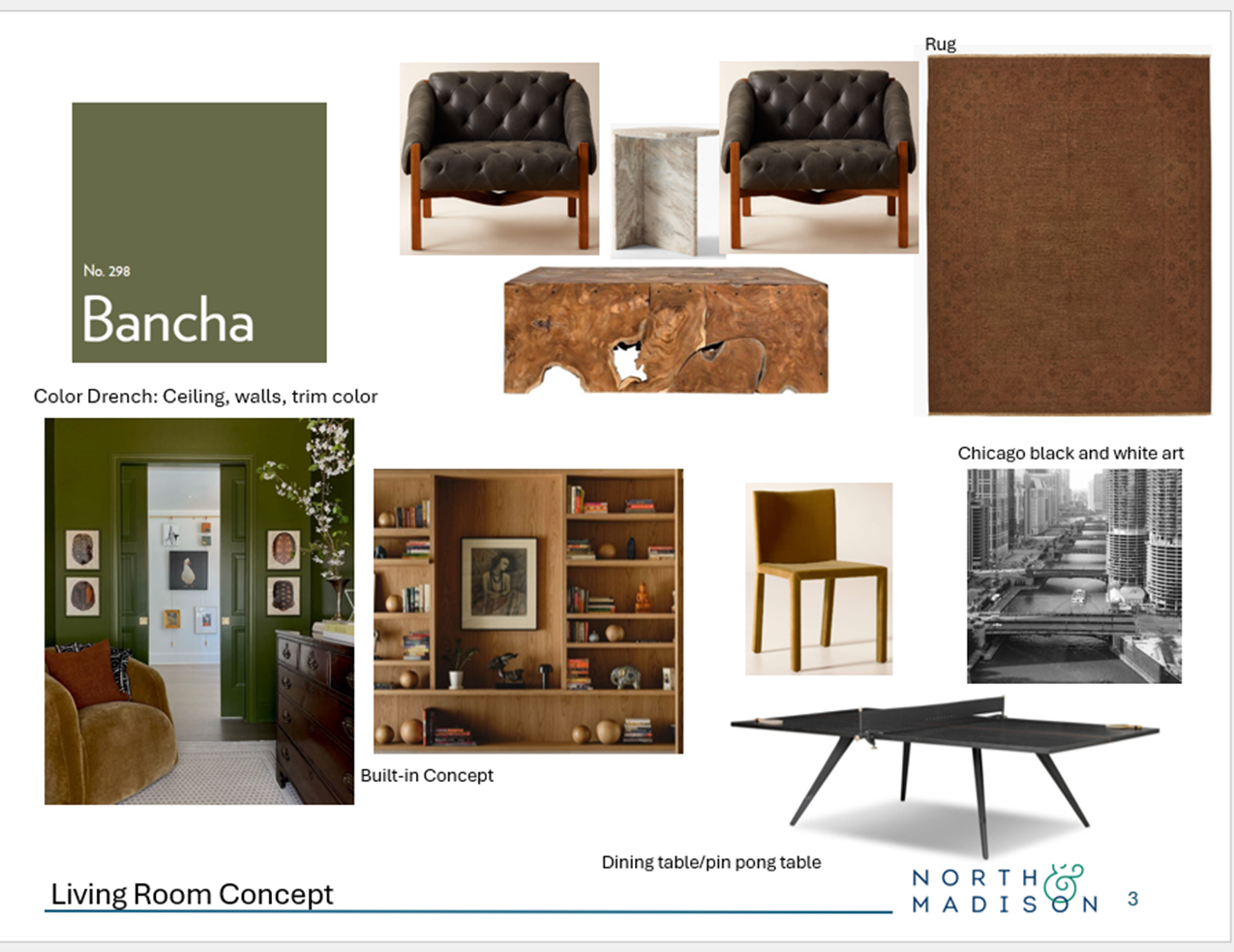 interior shot ping pong table is dining table add 6 of the yellow dinning chairs around the table add the couch and chairs across from each other with the wood coffee table in the middle by the window