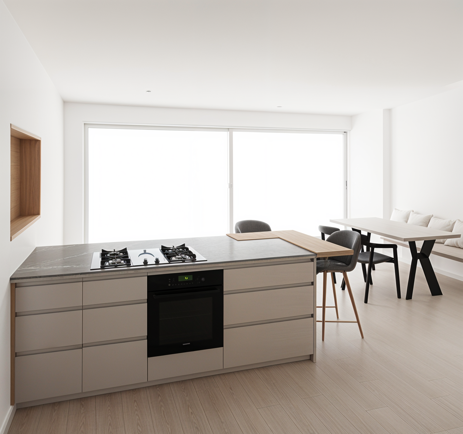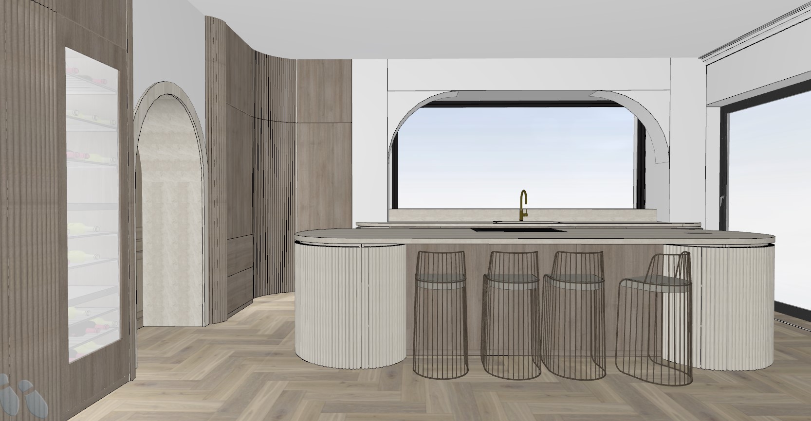 worktops are in romano travertine island base unit cabinets are also in romano travertine with fluted effect