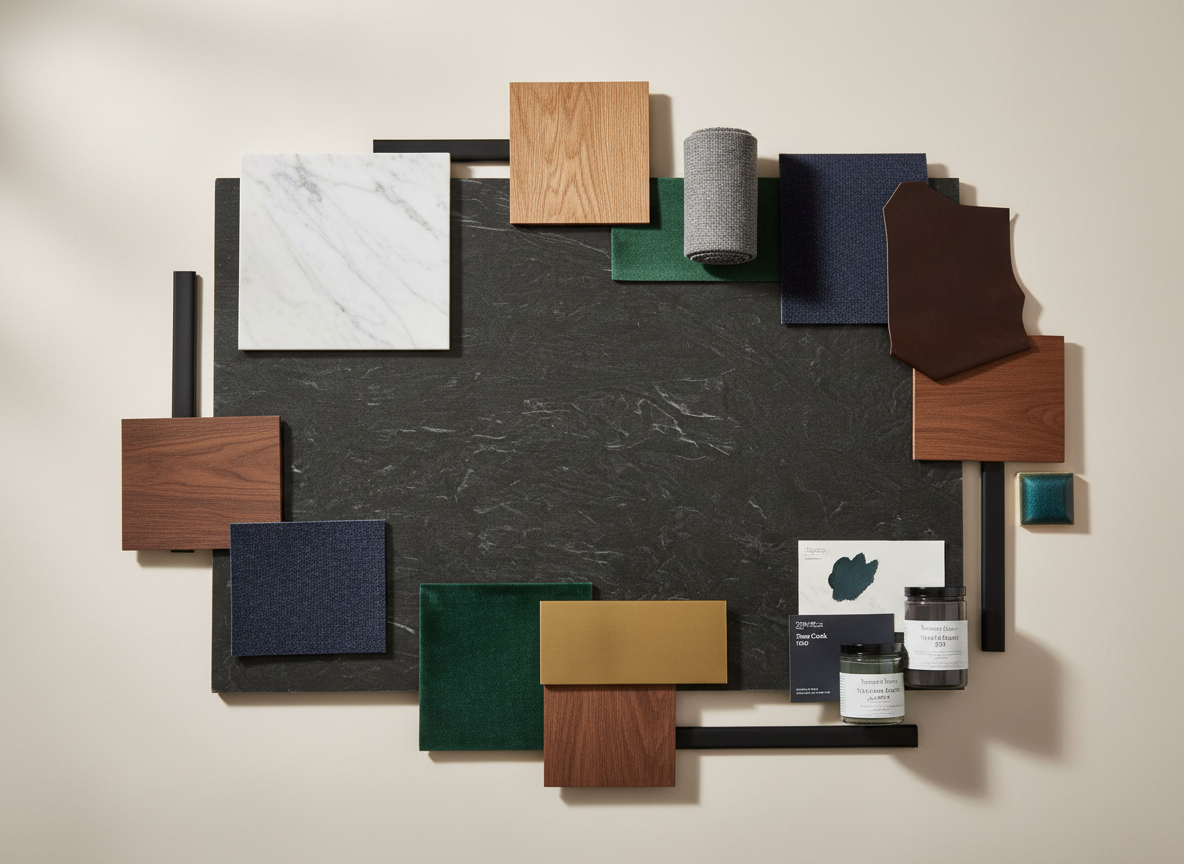 create a luxury mcm living room with virginia mist black granite as the fireplace