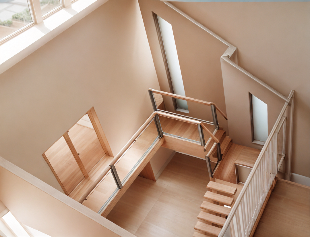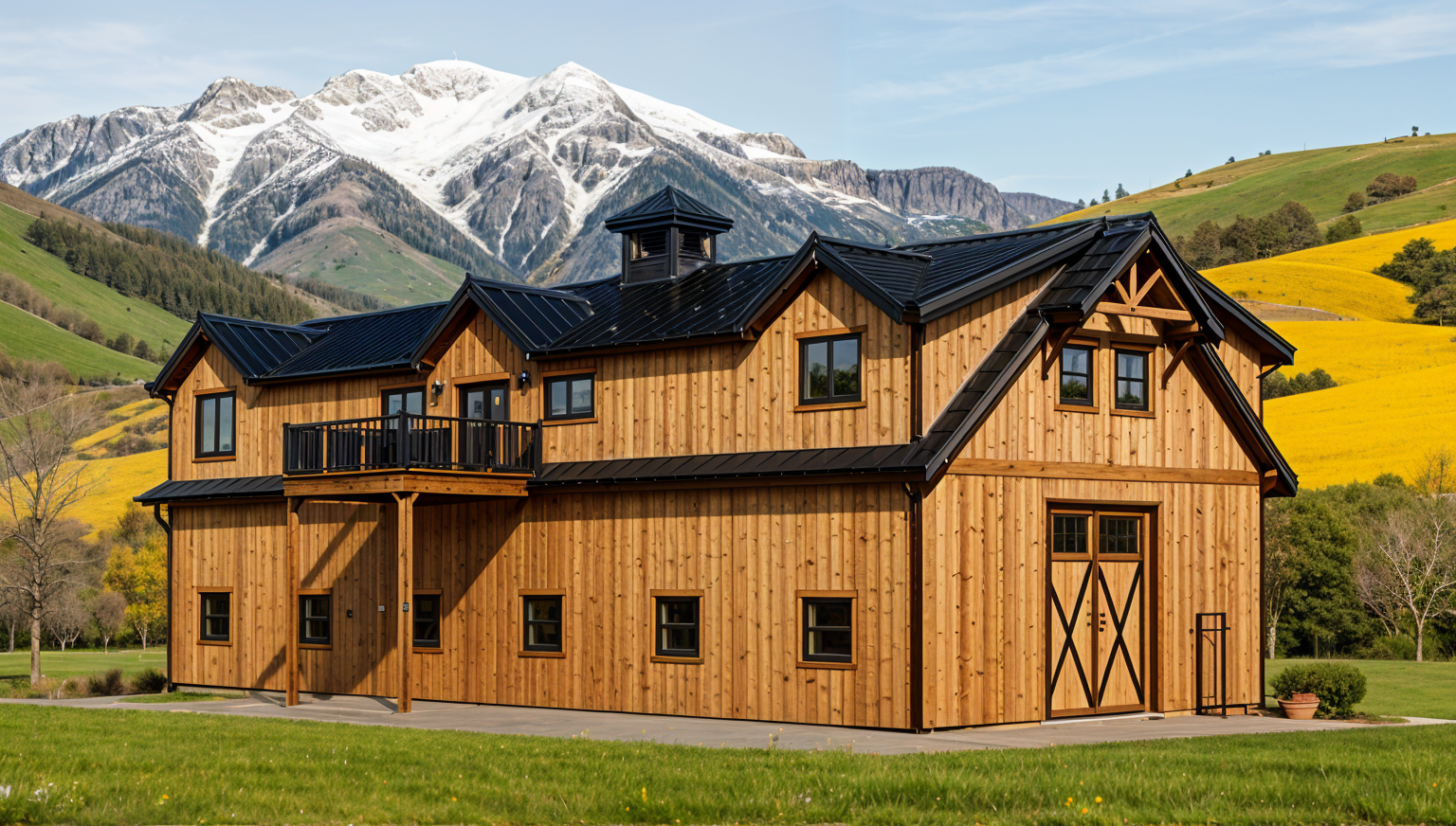 render a two story house with a modern design the exterior features horizontal siding in a green tone and a dark gray sloped roof metal roof the upper balcony is supported by dark wooden posts and has a black railing add two windows on the upper level with black frames and one larger window on the lower level create a soothing atmosphere with soft ambient lighting as if during a nice sunny day day the foundation is gray concrete with a subtle grass pattern at the base in deep green hues capture the architectural elements with crisp clean lines and ensure the overall mood feels calm and welcoming