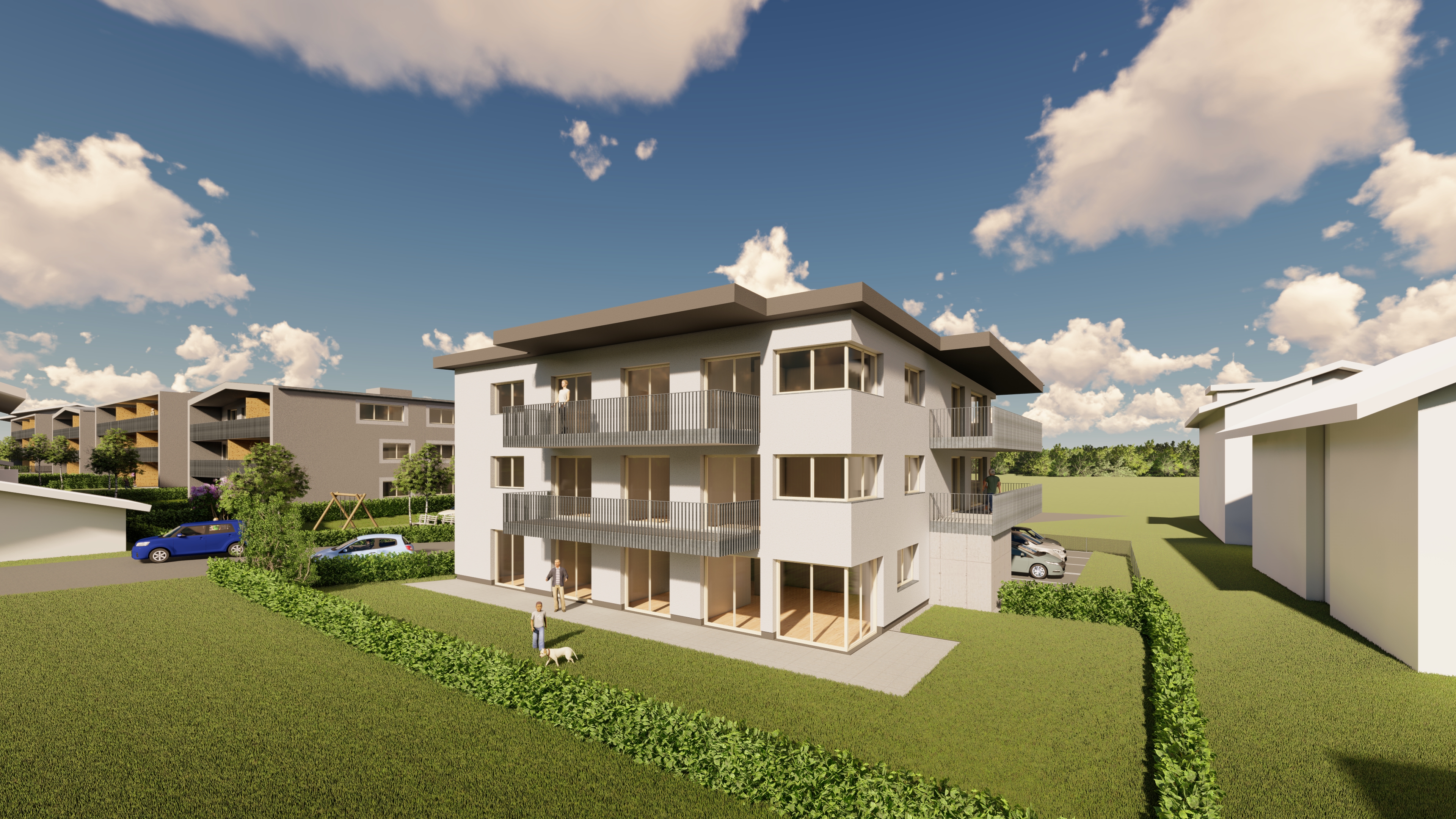 render the scene on a beautiful spring day the materials and colors must be maintained the facades in smooth plaster the windows as white plastic windows the balcony railings in galvanized dark steel depict the lawn realistically add a few people to the image the entire image in realistic and lively light