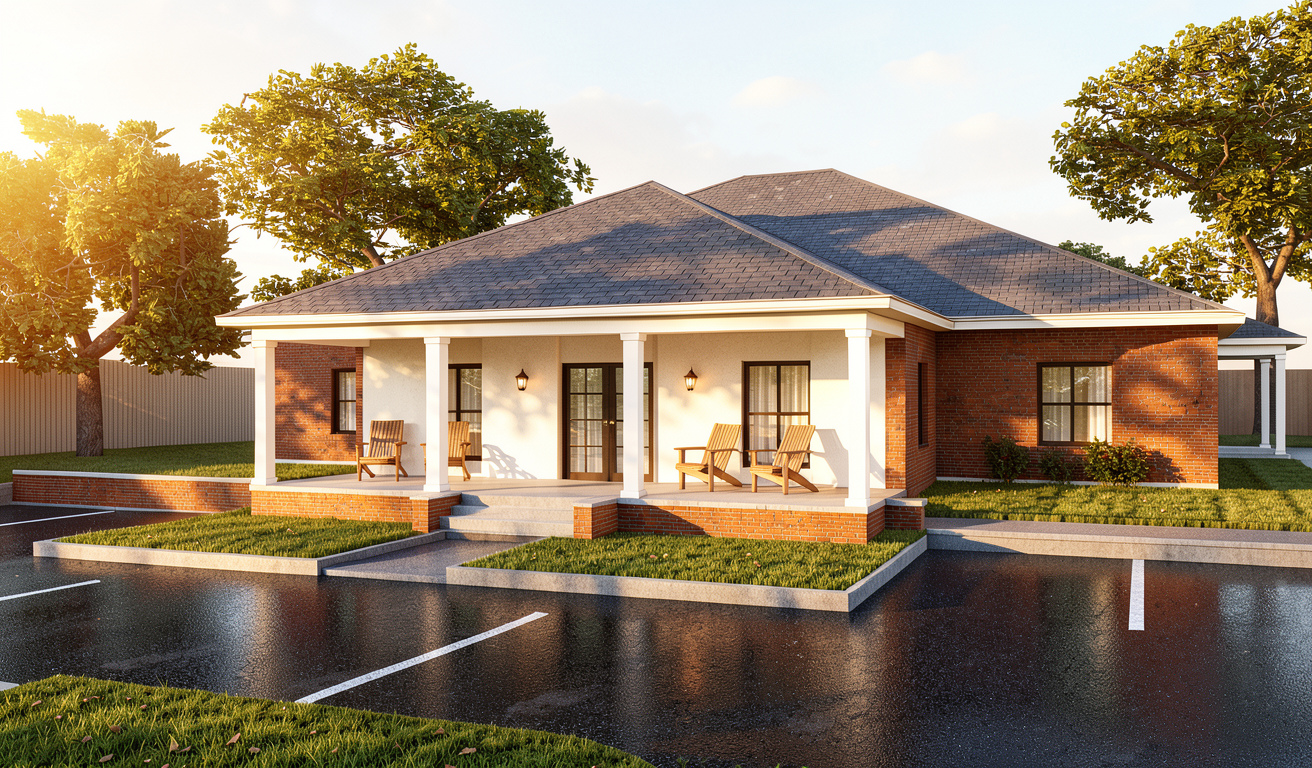 add eight rows of ground mounted solar arrays inside the area highlighted yellow keep the rows close to the ground rotate panels to face building on the right keep original image proportions