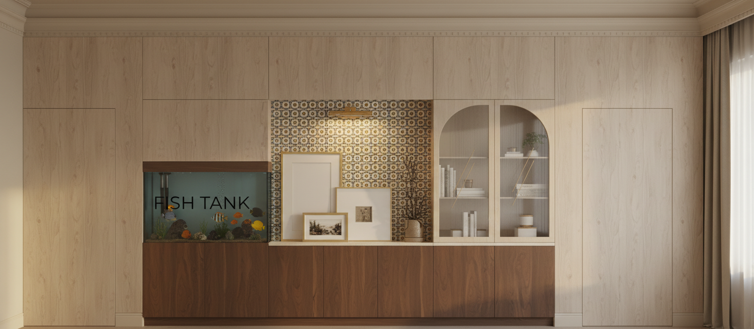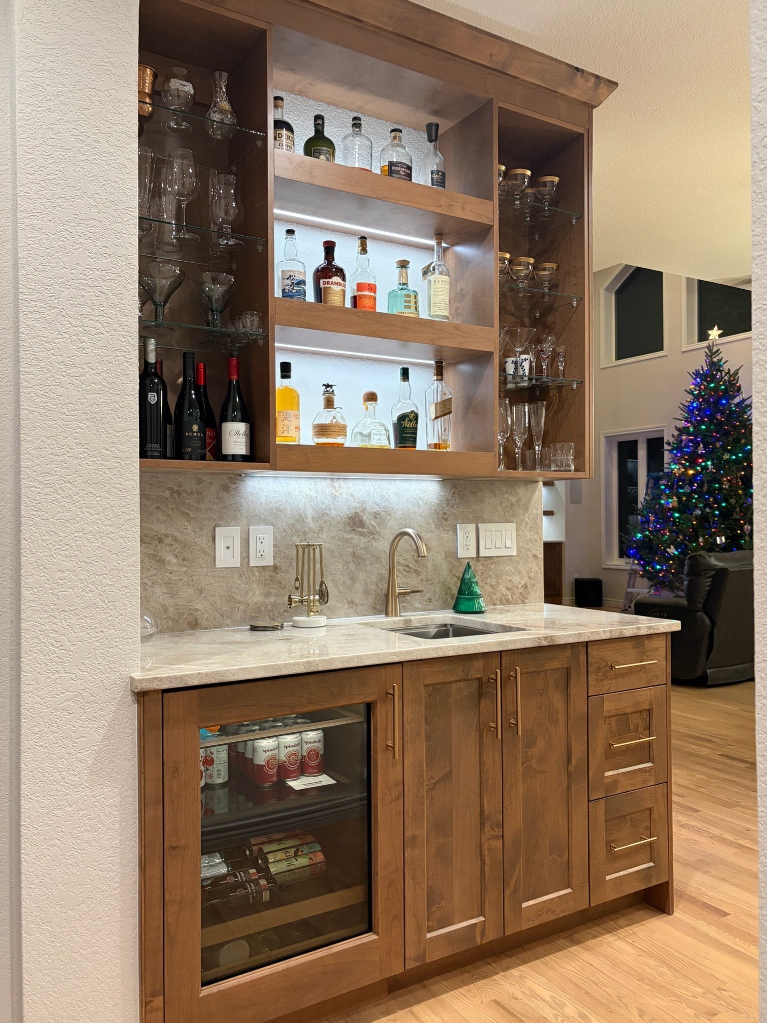 do not change the cabinets in any way preserve the exact cabinet colors materials finishes dimensions door and drawer styles hardware spacing alignment and all geometry exactly as shown do not alter the countertop shape backsplash appliances flooring lighting fixtures or wall structure only remove the construction materials clutter and mess from the scene clean the room and make it look finished and staged add a few simple tasteful home accessories appropriate for the style of the space but do not add or remove any furniture windows or architectural elements maintain the original lighting direction and realism enhance clarity and polish the photo while keeping the cabinetry and room design completely unchanged do not alter the lighting to keep the cabinet colors as they are in the image stage for a simplistic modern bar