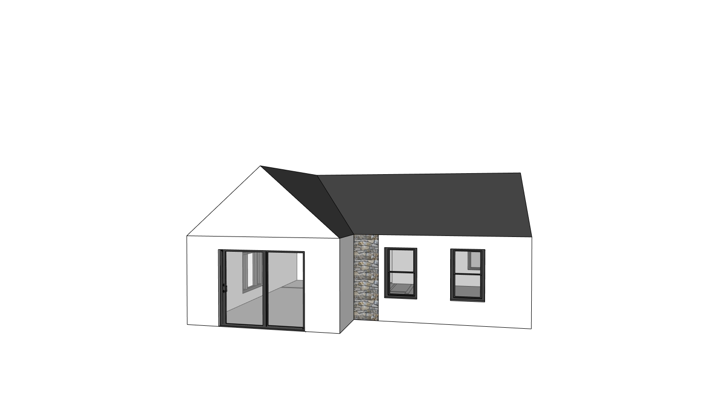 modern single story house with a minimalist design the exterior walls are painted in a crisp white contrasted by a sleek dark gray roof the front facade features a section of textured stone in varying shades of gray large glass sliding doors reflect light bordered by deep charcoal gray frames the atmosphere is serene and elegant set during golden hour with warm gentle lighting enhancing the textures
