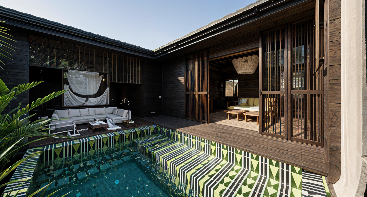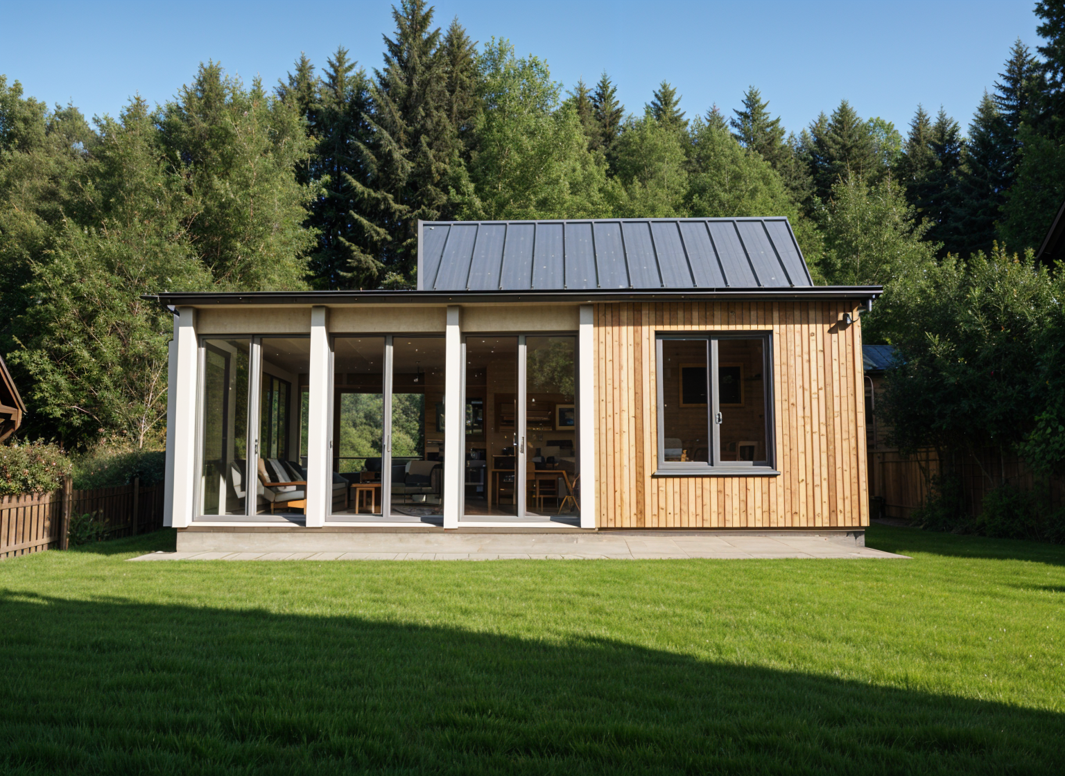 bauhaus exterior shot add grey double windows with no horizontal divider to openings add facade from vertical wooden stripes 15 cm between beams add cottage interior add grass in front architecture