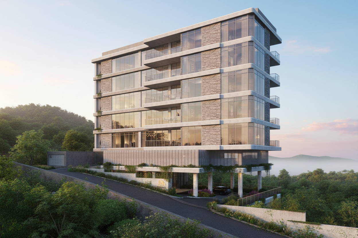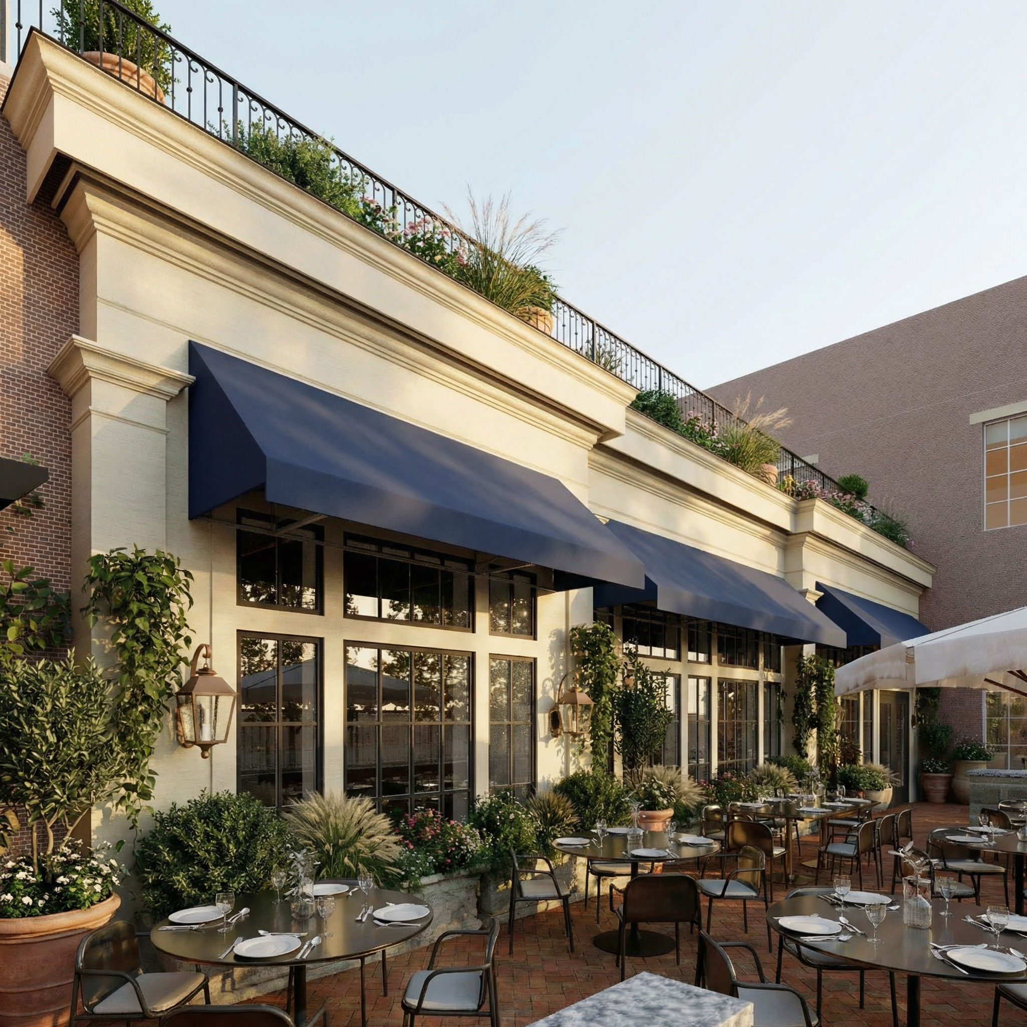 strict maintain exact building geometry massing proportions openings materials layout and camera perspective from the input revit model do not alter structure roofline window door locations patio layout or site walls project adaptive reuse of historic firehouse longworth s fire company no 15 in mount adams cincinnati ohio preserve entire existing structure including original firehouse and rear addition material intent all primary wall surfaces are existing red brick matching the reference photo aged cincinnati brick varied tone subtle weathering cream tan elements are painted exterior trim only window surrounds cornice banding not stucco or eifs no new wall materials introduced context match reference image closely sloped mount adams street condition with slight uphill grade brick paver sidewalk at building frontage low stone retaining wall with iron railing above mature street trees partially obscuring fa ade important adjacent buildings tight to sides urban hillside fabric black street lamps subtle historic character parallel street parking site patio maintain raised patio condition exactly as modeled black metal railing at patio edge outdoor dining with neutral umbrellas and simple furniture clean but slightly lived in not staged or perfect architecture details preserve historic firehouse fa ade proportions and detailing signage integrated cleanly no oversized or fake signage large storefront glazing at ground level with realistic reflections upper windows maintain original proportions and trim lighting early evening golden hour warm interior lighting visible through windows soft exterior accent lighting on brick and signage natural shadows consistent with street trees atmosphere photorealistic grounded true to life cincinnati urban hillside environment slight depth haze no stylization no exaggerated effects do not do not suburbanize the setting do not add parking lots or open space do not change materials do not clean up or modernize surrounding buildings excessively critical preserve all awnings exactly as modeled in geometry size projection and placement awnings are high end fabric canvas in a deep navy midnight blue tone almost black in low light matte finish with very subtle texture no gloss fabric is clean and tightly stretched with minimal sag crisp edges and refined proportions color should remain consistent across all awnings lighting creates soft natural gradients across the fabric surface with slight warmth from nearby lighting do not change awning shape remove them or alter their alignment add curated restaurant patio landscaping inspired by upscale european style outdoor dining incorporate a mix of planters medium and large round planters in neutral tones light stone terracotta off white ceramic dense green shrubs and small ornamental plants with natural variation climbing vines trained vertically along wall surfaces between windows subtle not overgrown planter placement along patio edges near railing between window bays to soften fa ade rhythm near entry points and corners for layering vegetation style lush but controlled well maintained not wild mix of leafy greens with varied sizes and textures slight natural asymmetry for realism do not block major architectural elements or signage maintain clear circulation paths