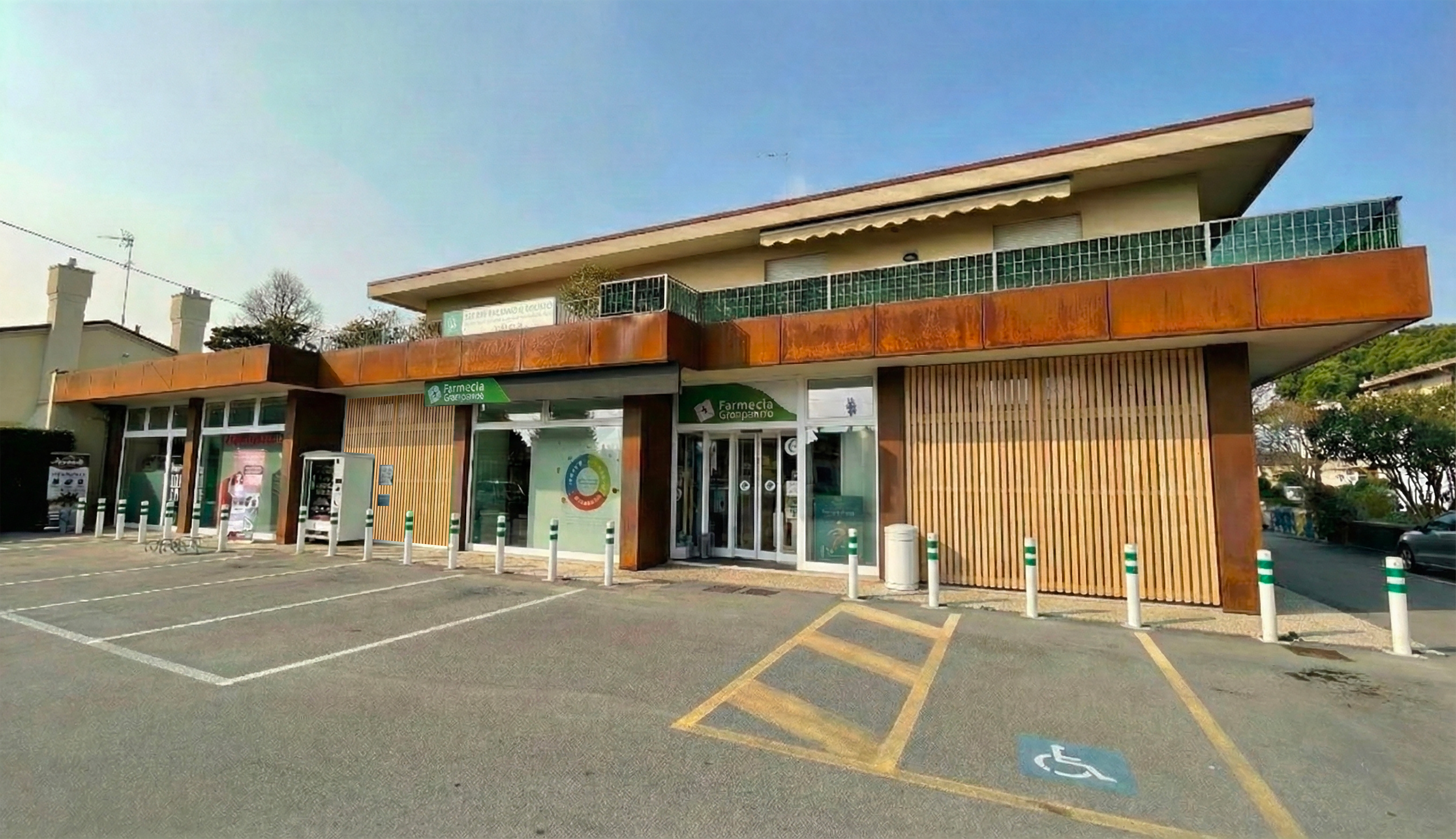 posiziona una fioriera alta 60cm in corten come la fascia sopra con verde e un ulivo sotto lo spigolo sporgente di destra occupando una porzione del marciapiede e posto auto