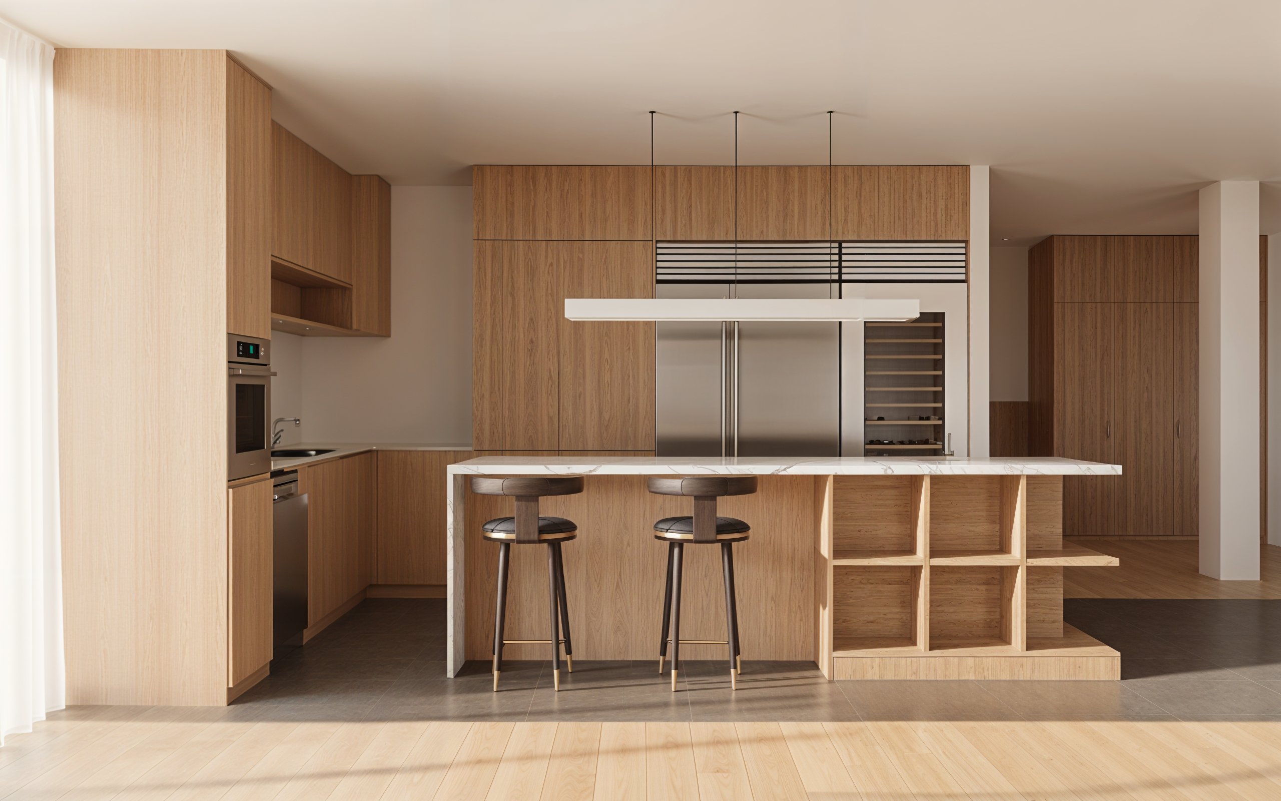 warm white kitchen with a oak kitchen cabinet doors with marble countertops on a sunny day