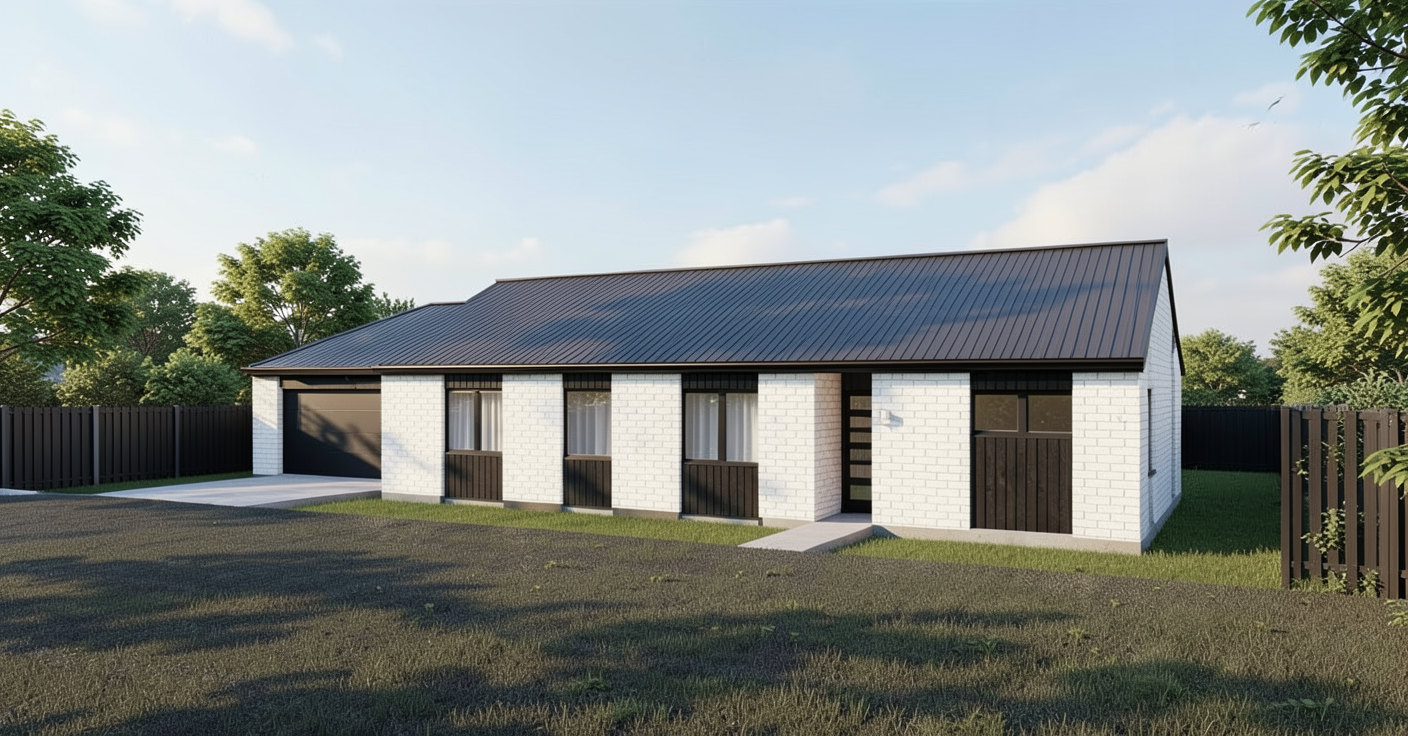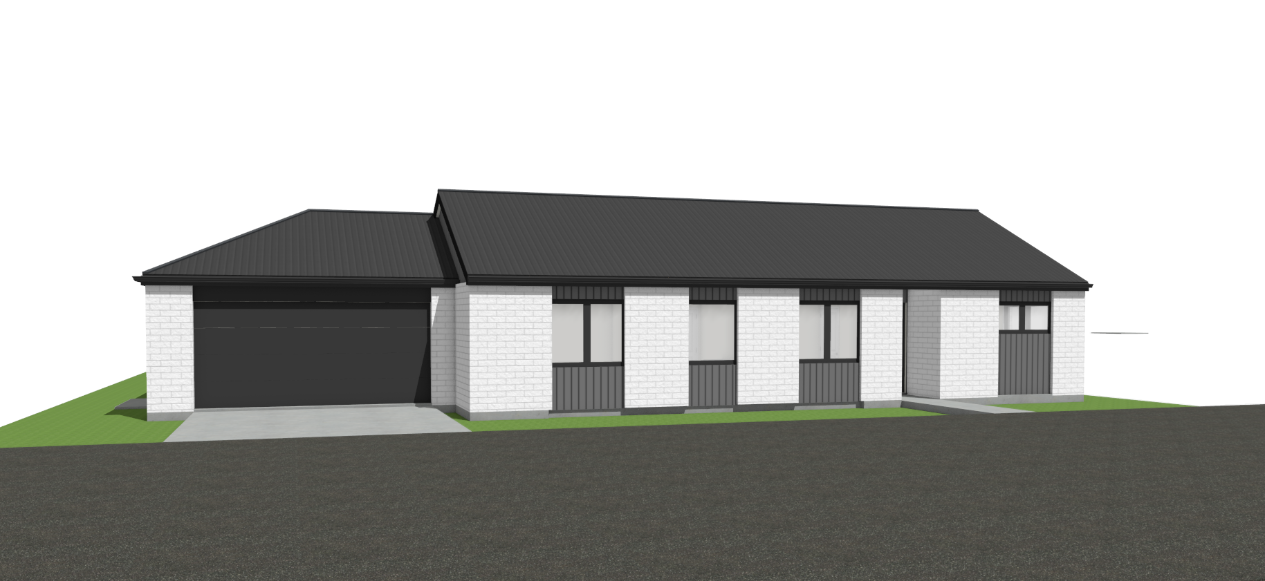 white brick black wood with a concrete driveway and fencing no grass