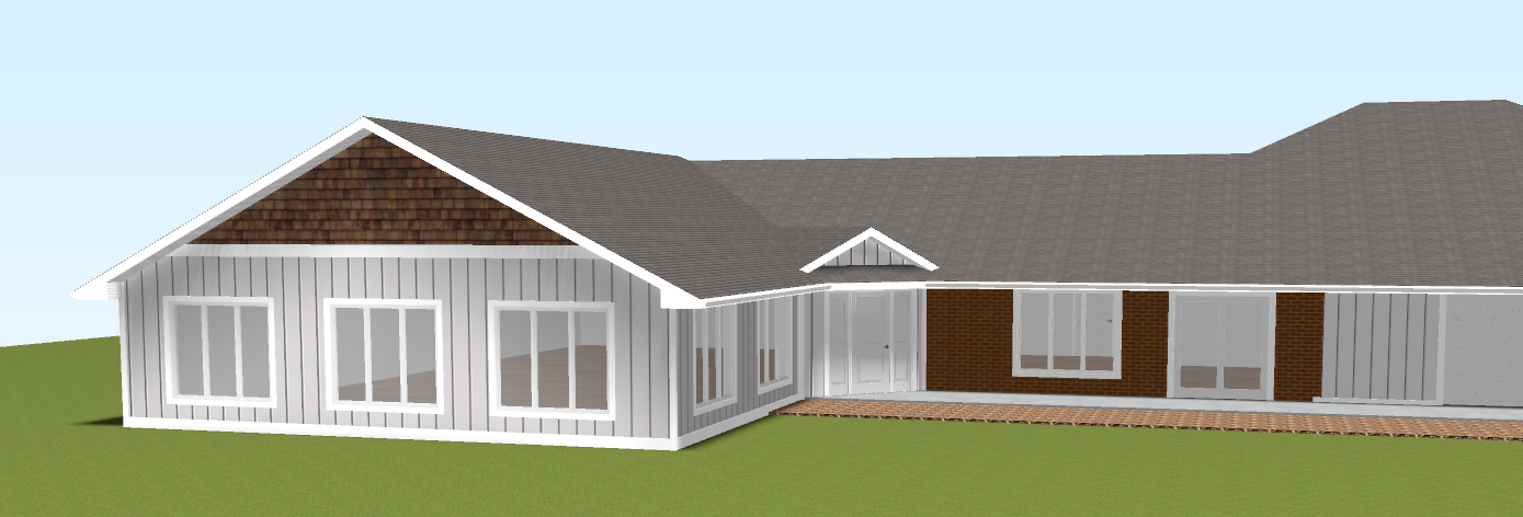 dark olive green siding black windows dark taupe trim owens corning sable shingles black brick brown shakes in gable add trees in backdrop