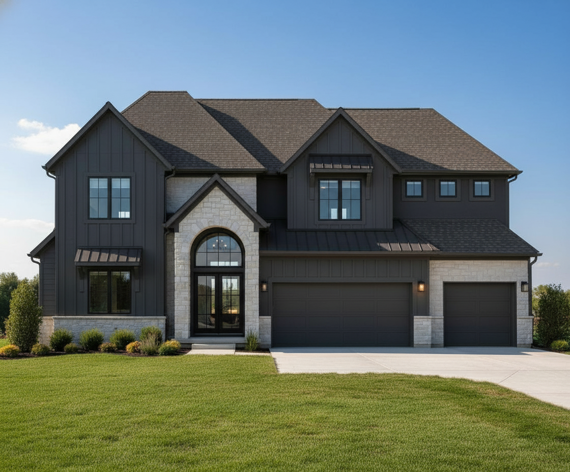 add a riverpools x36 model pool cedar gazebo with curtains add outdoor furniture make the siding iron ore colored no stone or brick on the house black windows do not change the layout add landscaping zoom out far to show landscaping and house make the deck all brushed concrete
