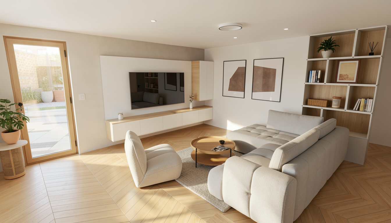 soffitto in cemento grigio chiaro strip led sotto i pensili cucina prima anta dell armadio con specchio tubo rosso sprinkler a soffitto parte in legno pensili rovere chiaro mantieni colori arredi