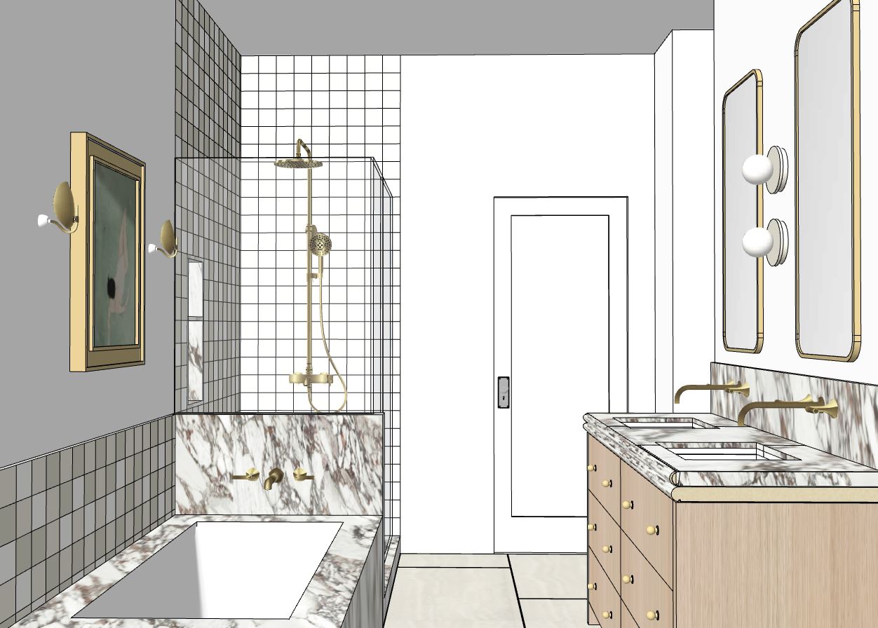 create a photorealistic rendering of this bathroom with soft warm indirect lighting