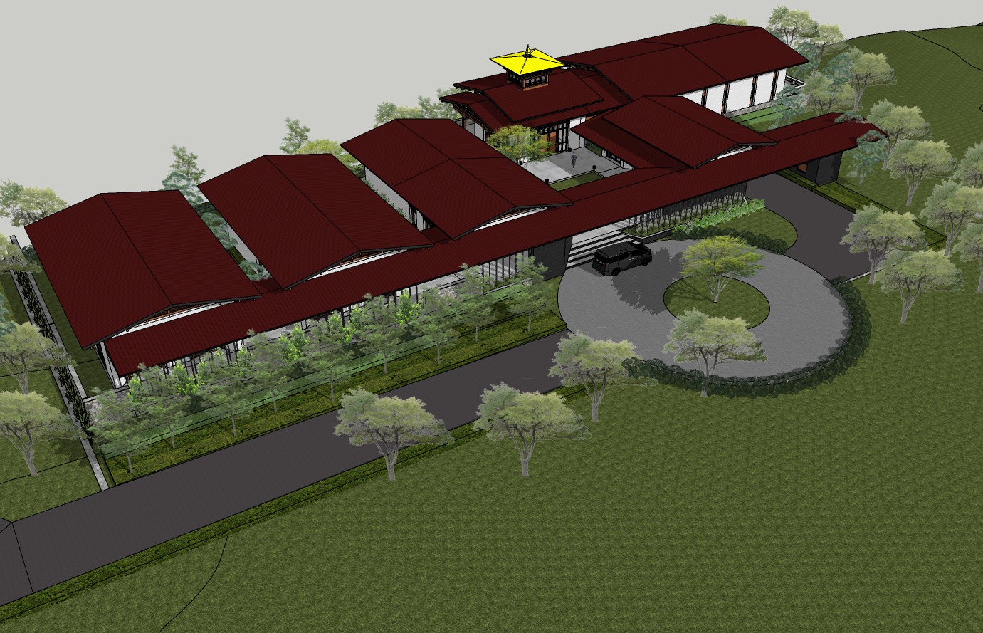 behind the house is a cliff that drop down that roof is aluminium in matt maroon color with the top square roof in gold for the royal family the sun light is too harsh make it softer
