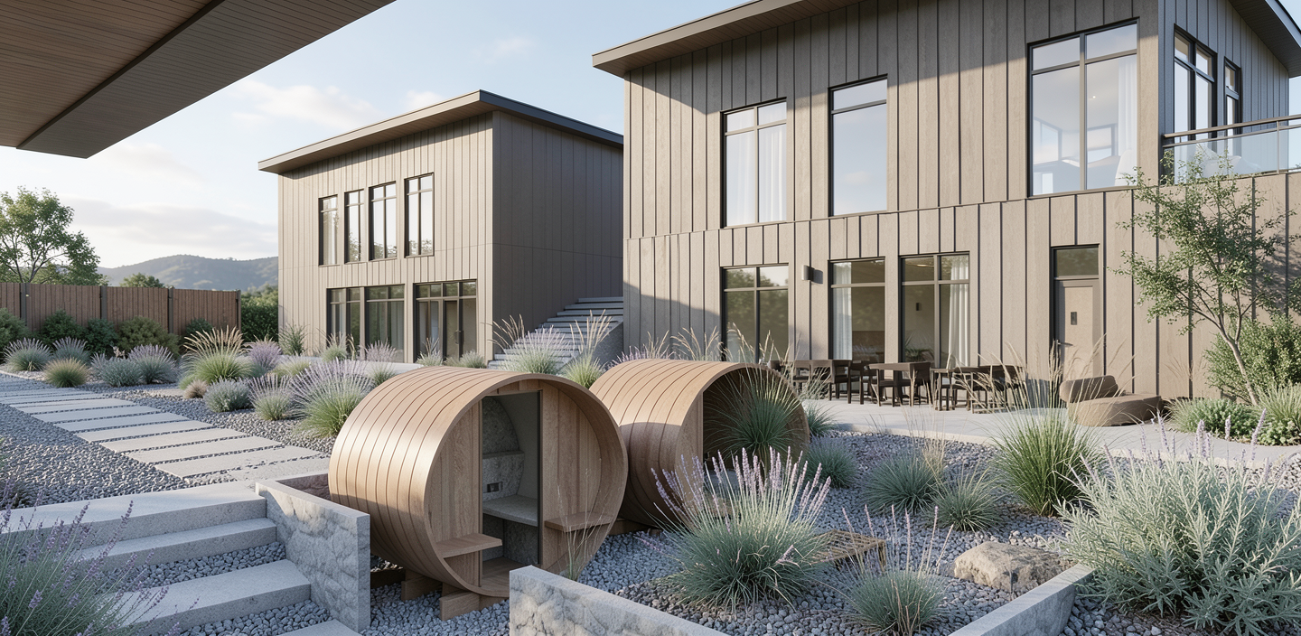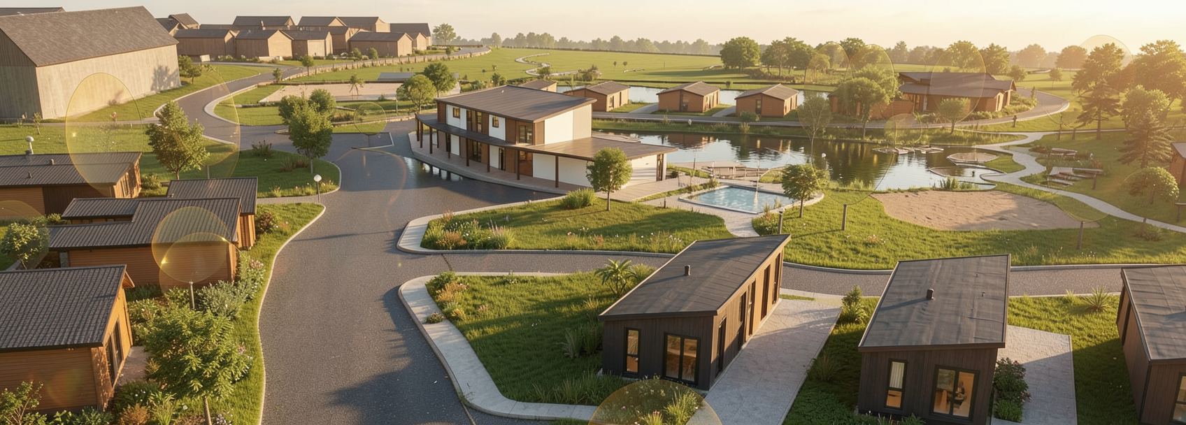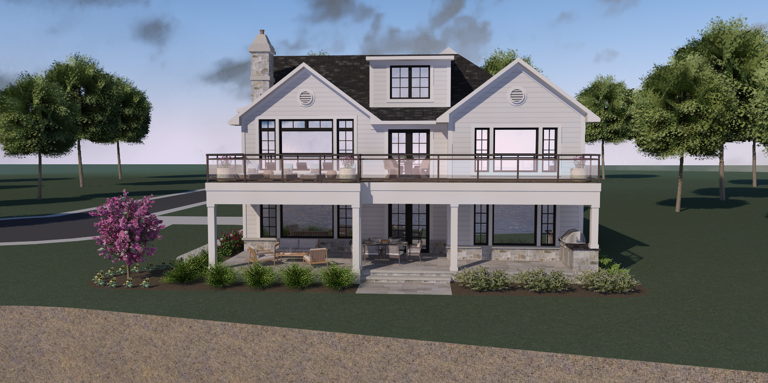 partly cloudy sky add gutters and downspouts some houses and deciduous trees in background cliff in front water reflecting in windows