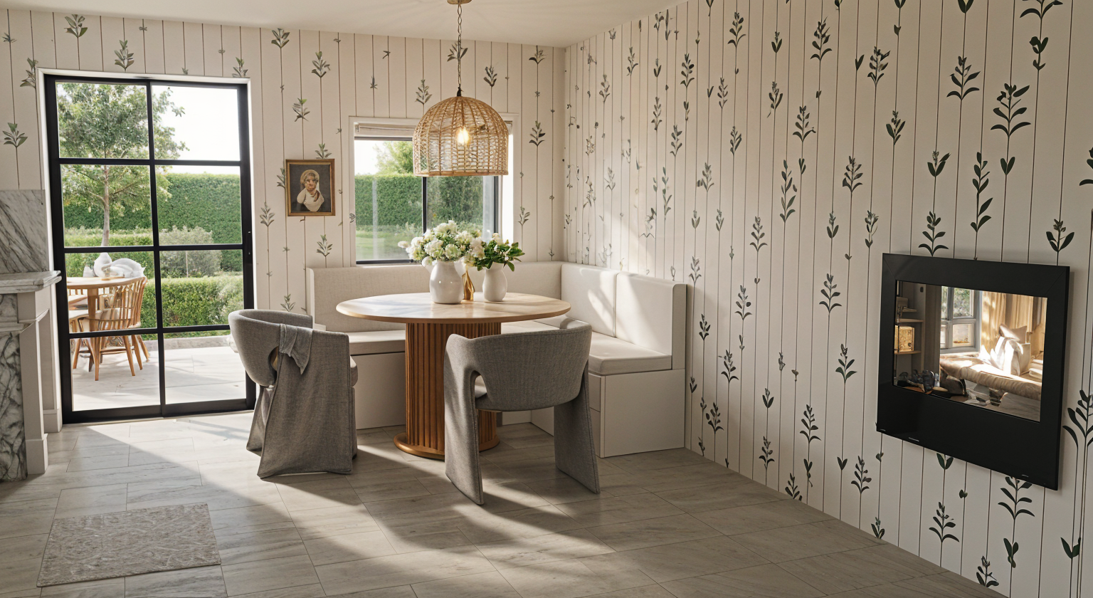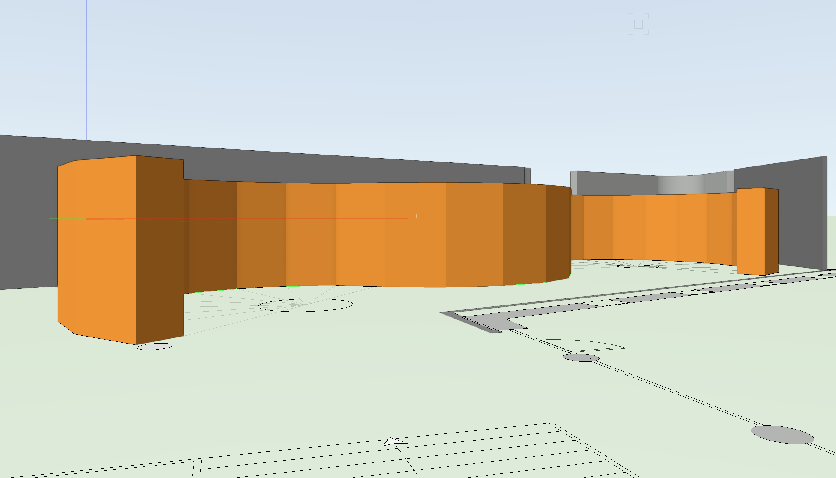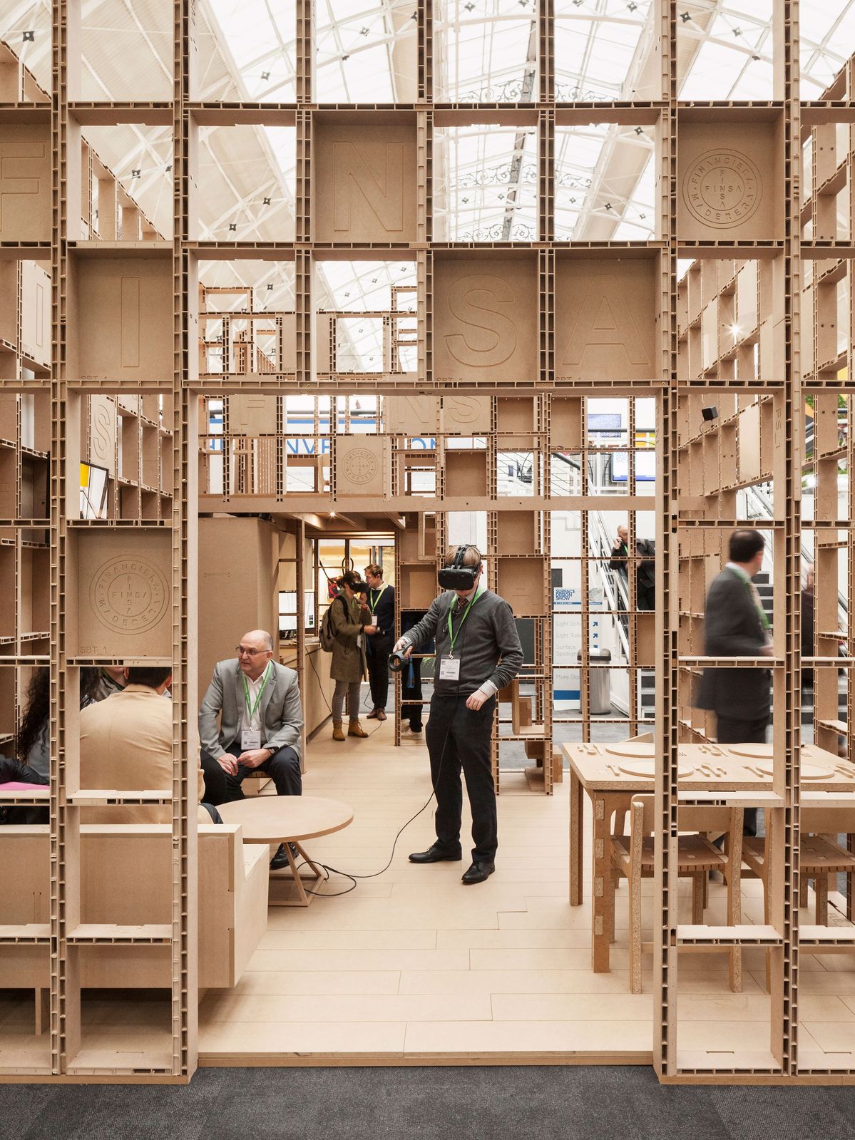 exterior shot replace curved central element with a dense modular wooden framework composed of repetitive square grid units approx 40 50 cm structure made of light raw wood pine plywood forming a semi open lattice with higher density than a simple scaffolding system integrate exhibition content directly the grid suspended photographic panels black and white varying sizes embedded objects craft tools containers organic materials like straw or fibers occasional solid backing panels to create contrast and support alternate between empty filled and semi filled modules to create rhythm and visual storytelling maintain overall footprint of the curved layout but reinterpret it as a fragmented faceted path rather than a continuous wall create immersive passages through the structure allowing visitors to walk around and partially enclosed by the modules vary heights and densities to generate moments of compression and expansion style vernacular tactile ethnographic exhibition visible construction logic raw materials warm tones lighting soft warm with shadows cast through the wooden grid enhancing depth and layering atmosphere archival narrative material focused blending architecture and storytelling display