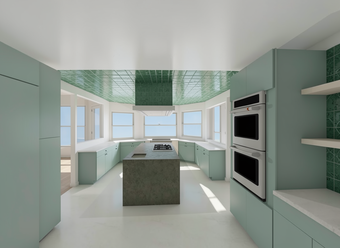 make the green tile on the ceiling structure a zelig time style tile ceiling must be flat white color remove tile on the ceiling remove all tile from kitchen ceiling please remove all the tile in the ceiling
