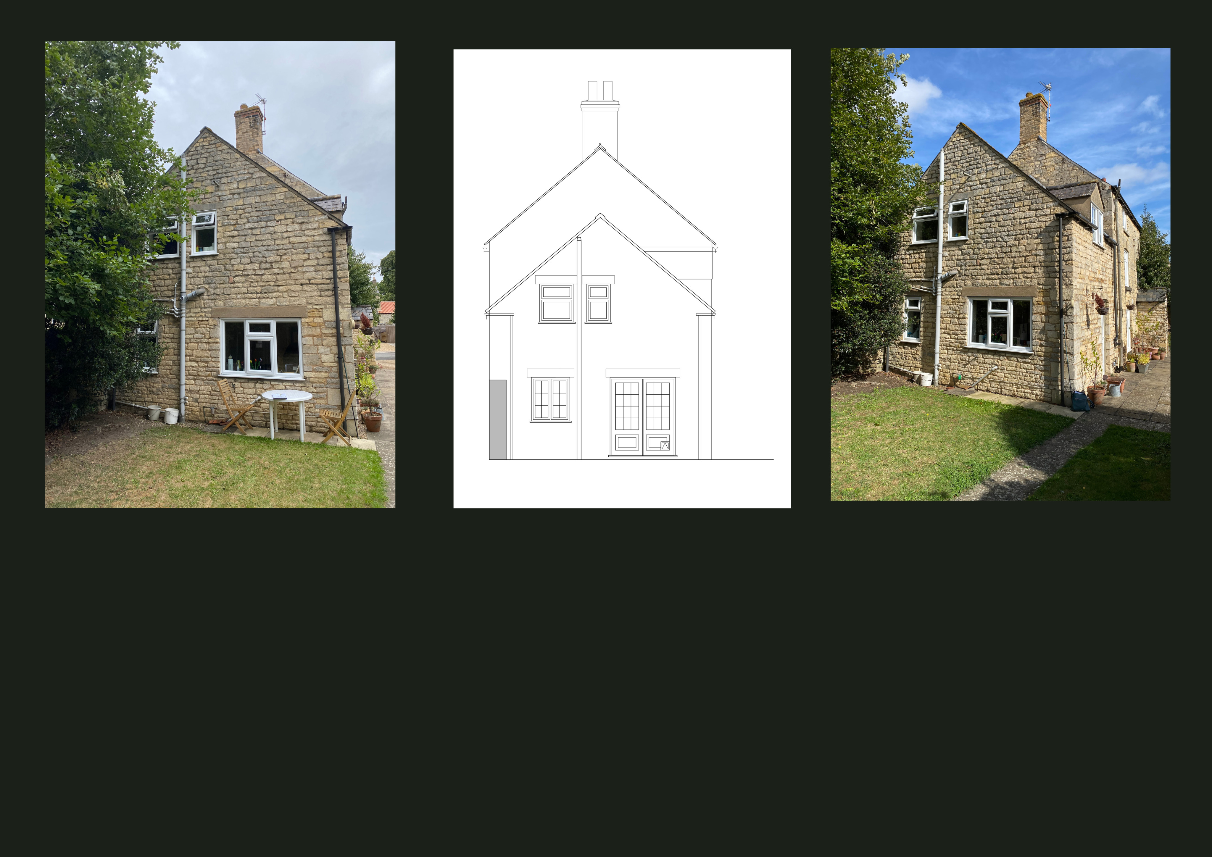 exterior shot windows and doors to remain as the source sketch and use the moodboard for building materials