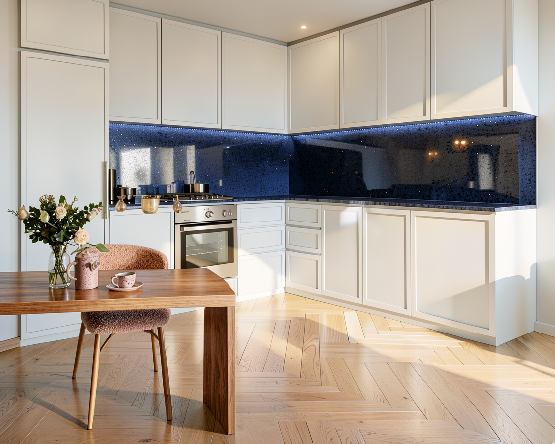 add a tile backsplash and give the countertops gray veining