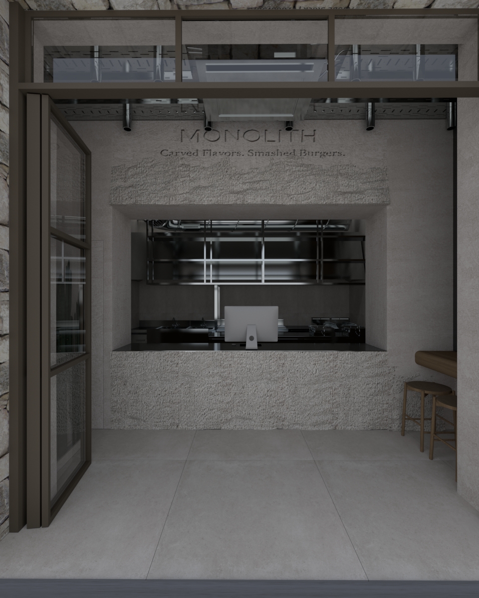 create a photorealistic rendering lights on nice midday atmosphere keep the same geometries and materials change only the rock effect in front and do it harder and realistic as a natural stone