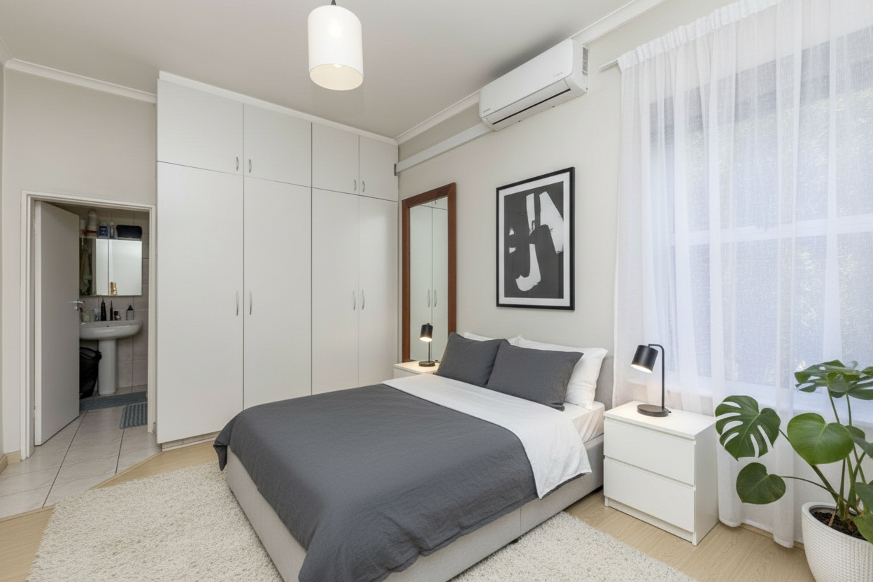 louvered privacy stall doors no glow from behind the doors please wallpaper in grey tones only wood to be slightly lighter add recessed pot lights to ceiling counter top to be dark grey solid quartz countertop