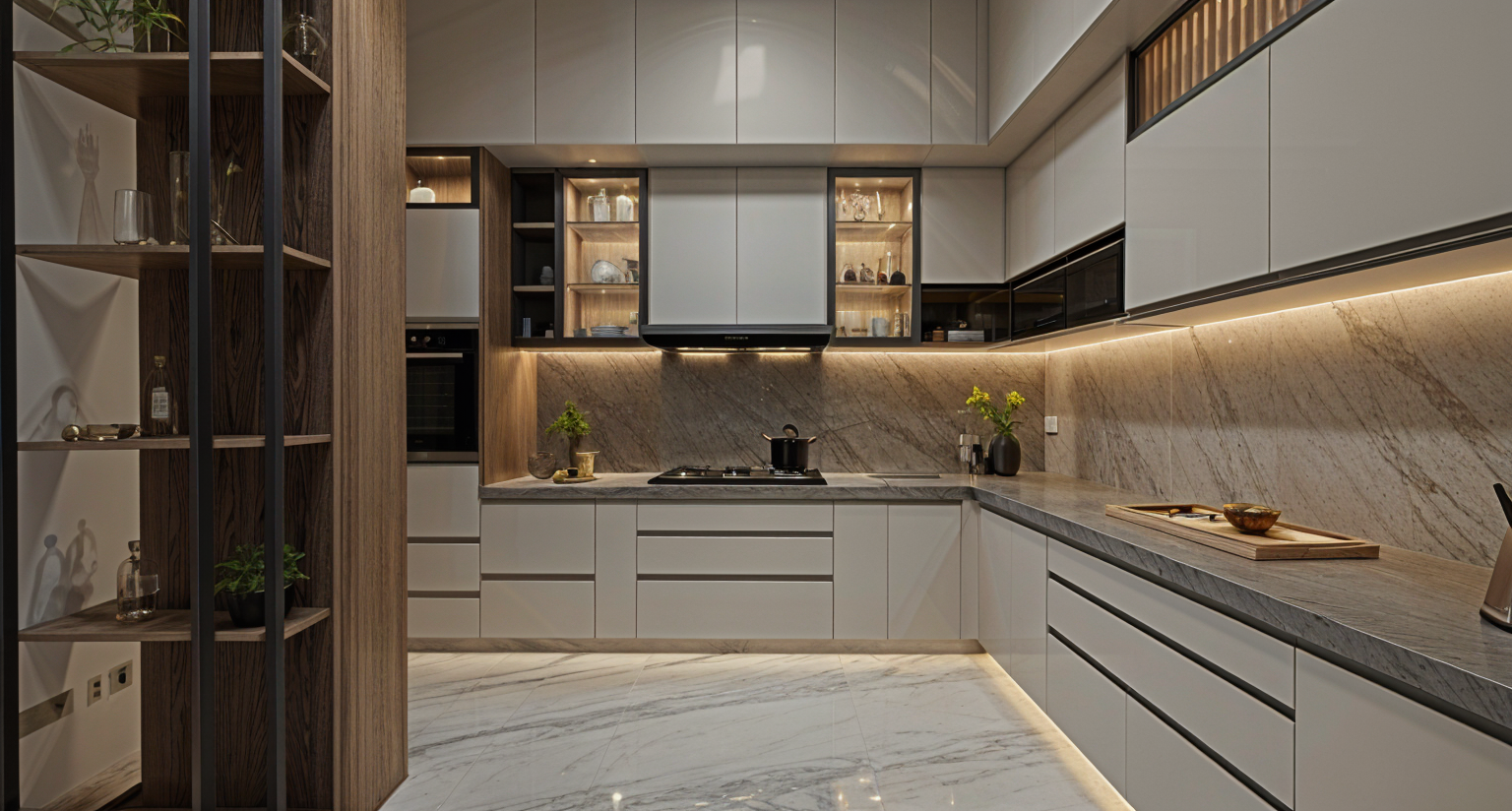 generate a high quality realistic render of a kitchen with beige acrylic glass shutters providde under cabinet lights and add lights in the skirting provide white marble flooring