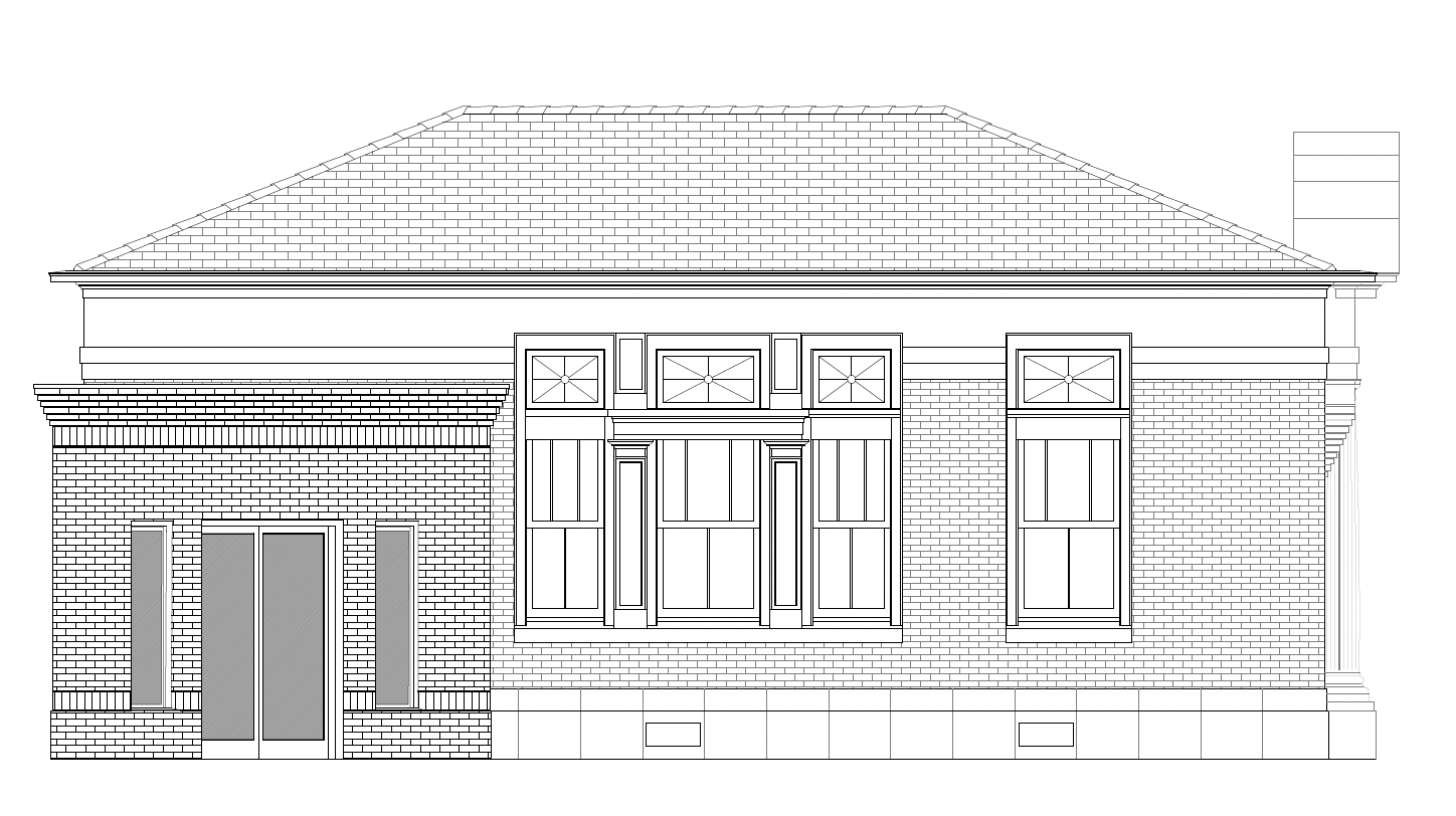 brick building with stucco entablature frosted windows on left addition only