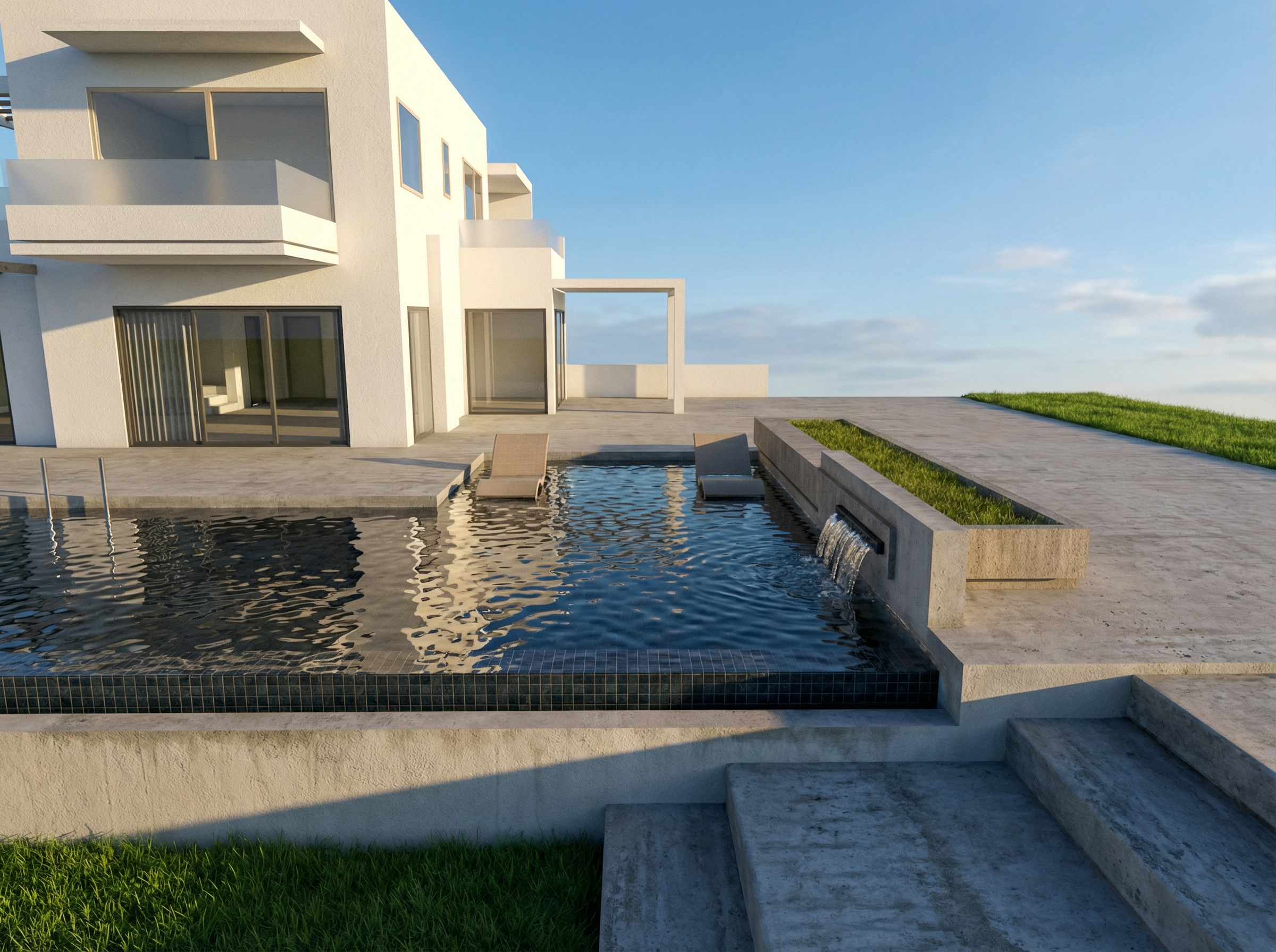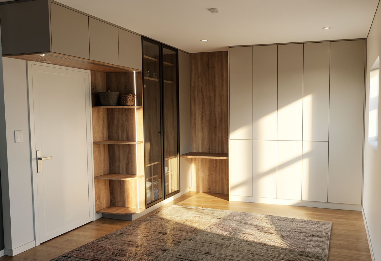 interior rendering of a ceramics supply store in cape town based strictly on the provided 3d model geometry do not change layout or proportions scene description match model exactly view from inside the store looking towards the shelving wall flooring muted wooden vinyl flooring running along the long side of the space left side full height terracotta brick lattice wall in front stacked rectangular clay bricks on the floor center two display plinths base gabion baskets made of metal mesh filled with stones middle open plywood box shelf top thick natural stone slab back wall long continuous shelving unit lower section plywood drawers upper section recessed niches inside niches slanted shelves made of galvanized steel shelves display ceramic glaze tiles above shelving soft linen textile panels hanging to the ceiling slightly irregular off white right side pos counter with curved front base gabion basket filled with stones top clean plywood countertop wall mounted shelves behind pos far right seating nook built in plywood bench with solid ash seating surface small chair coffe table with a stone slab as a table top ceiling exposed track lighting system running longitudinally left side clay brick wall with wooden pegs inserted generating space for displaying tools and objects suspended from the pegs materials very important make materials realistic and tactile plywood light visible grain matte finish solid ash wood slightly warmer tone than plywood galvanized steel shelves slightly reflective industrial finish gabion baskets metal mesh with irregular natural stones inside terracotta bricks warm slightly rough texture stone slabs heavy natural slightly uneven edges linen fabric soft slightly translucent subtle folds ceramic tiles varied glaze finishes glossy matte textured avoid plastic or overly clean surfaces lighting only from the track lighting track lighting with spots on the shelving units and plinth highlighting shelving wall soft shadows atmosphere calm tactile craft oriented space slightly raw not overly polished balance between workshop and gallery emphasize material contrast rendering style ultra realistic architectural interior rendering high detail global illumination natural materials soft shadows no people no clutter clean but not sterile