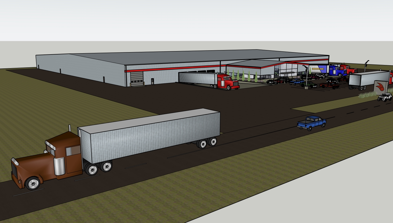 new building with metal siding and metal roof flat rural setting some small trees in the background large window on front of building new asphalt blue sky some clouds