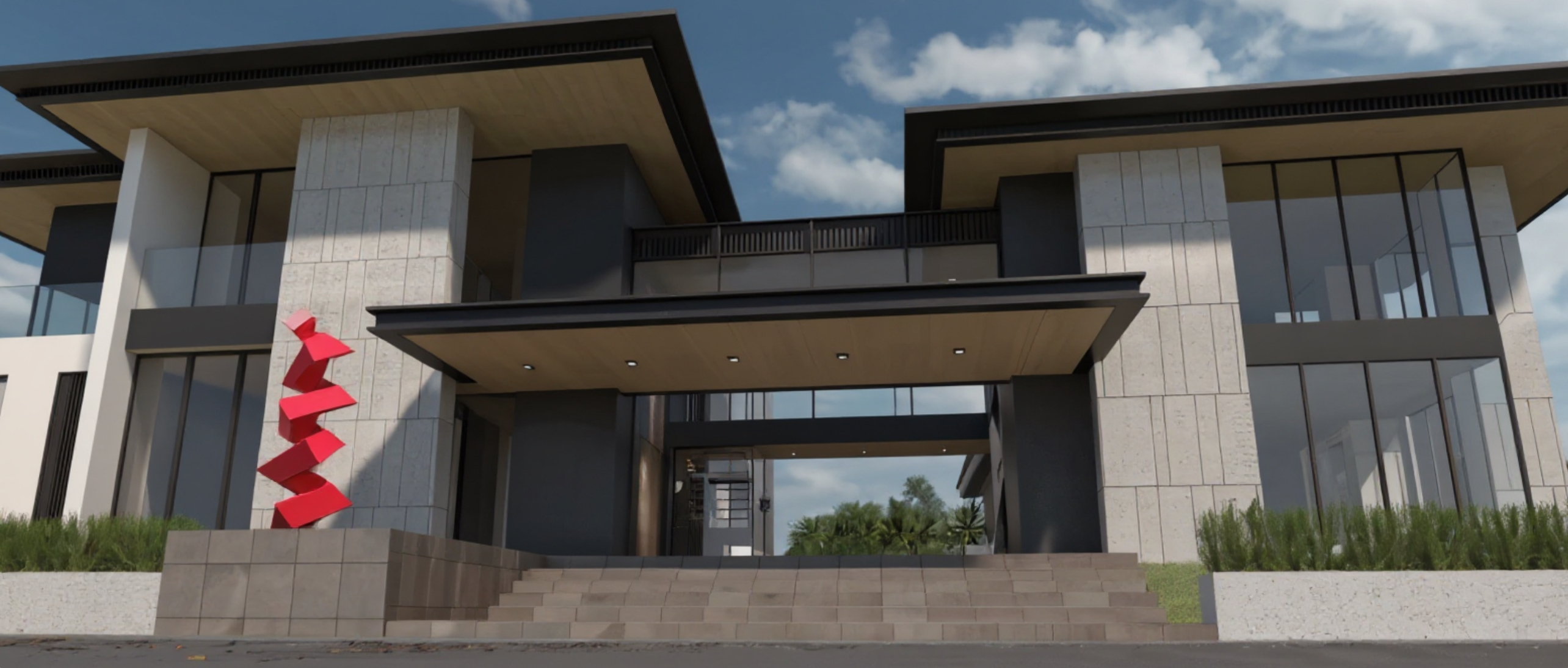 modernist exterior shot realistic rendering dawn scene turn on all interior lights led strips light on entry steps architecture