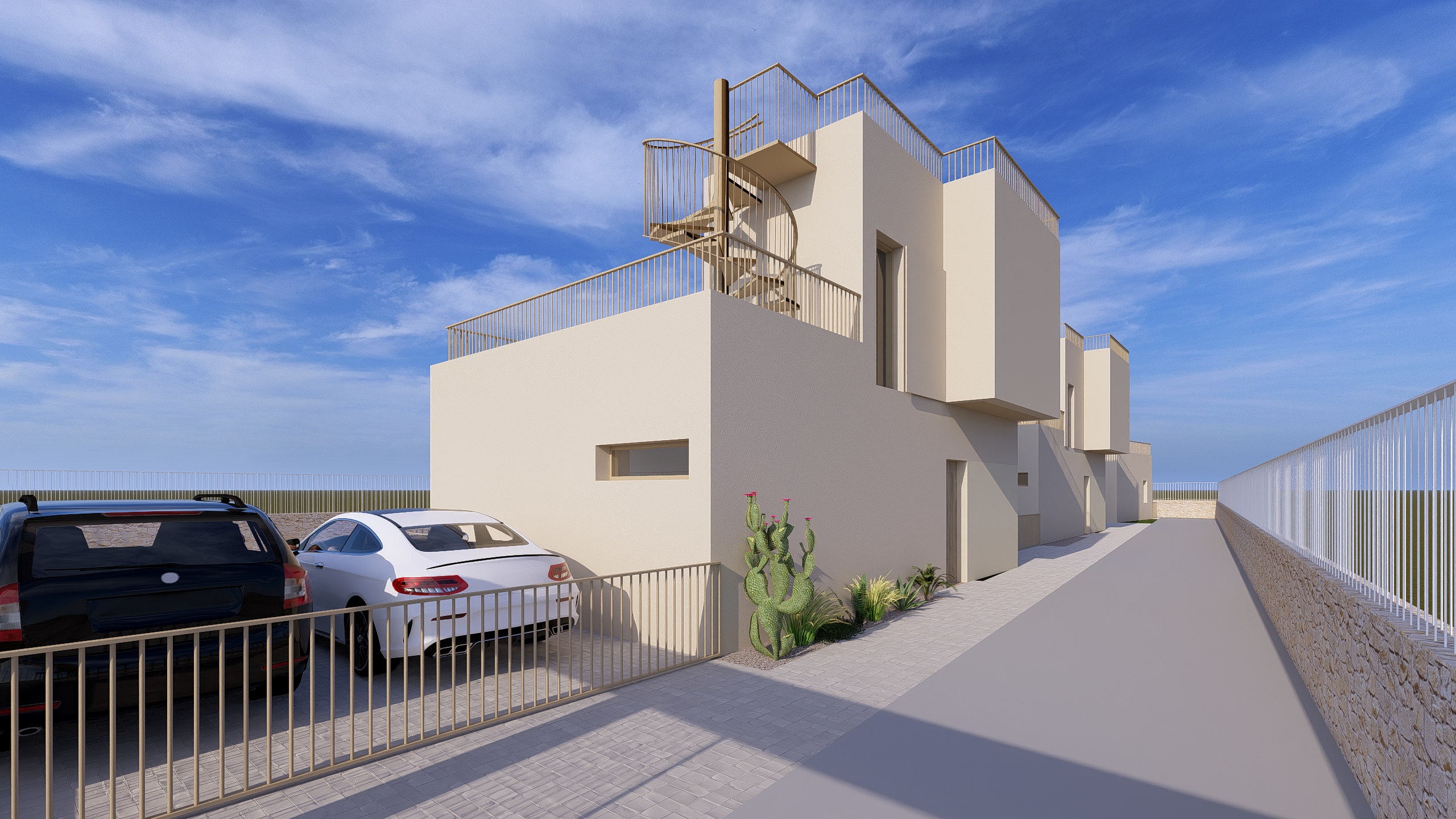 a ade vegetacion tipica mediterranea en la parte exterior de la urbanizacion quiero un atardecer tipico mediterraneo y luces en planta baja a 2 20m sobre el suelo