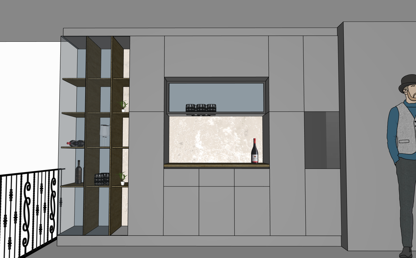 special wine cabinet with glass doors and several shelves in the first three modules and a working area with a wooden counter contemprary design realistic render