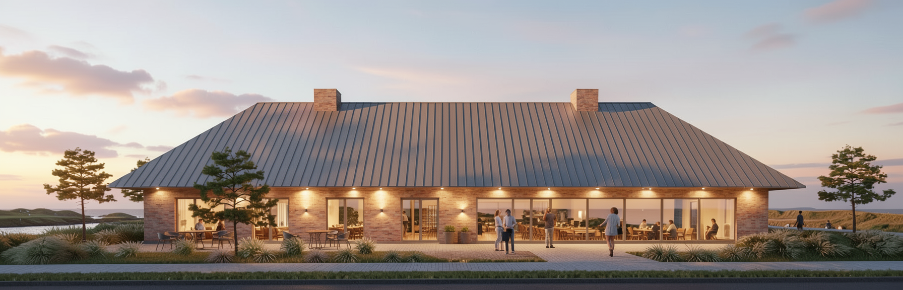use the provided enscape render as base reference keep exact layout proportions and camera angle keep materials and facade disposition make it a japanese scandinavian restaurant with and arrival area with vegetation from the danish west coast make it a late summer evening add lighting on facade add a few anatomically correct people
