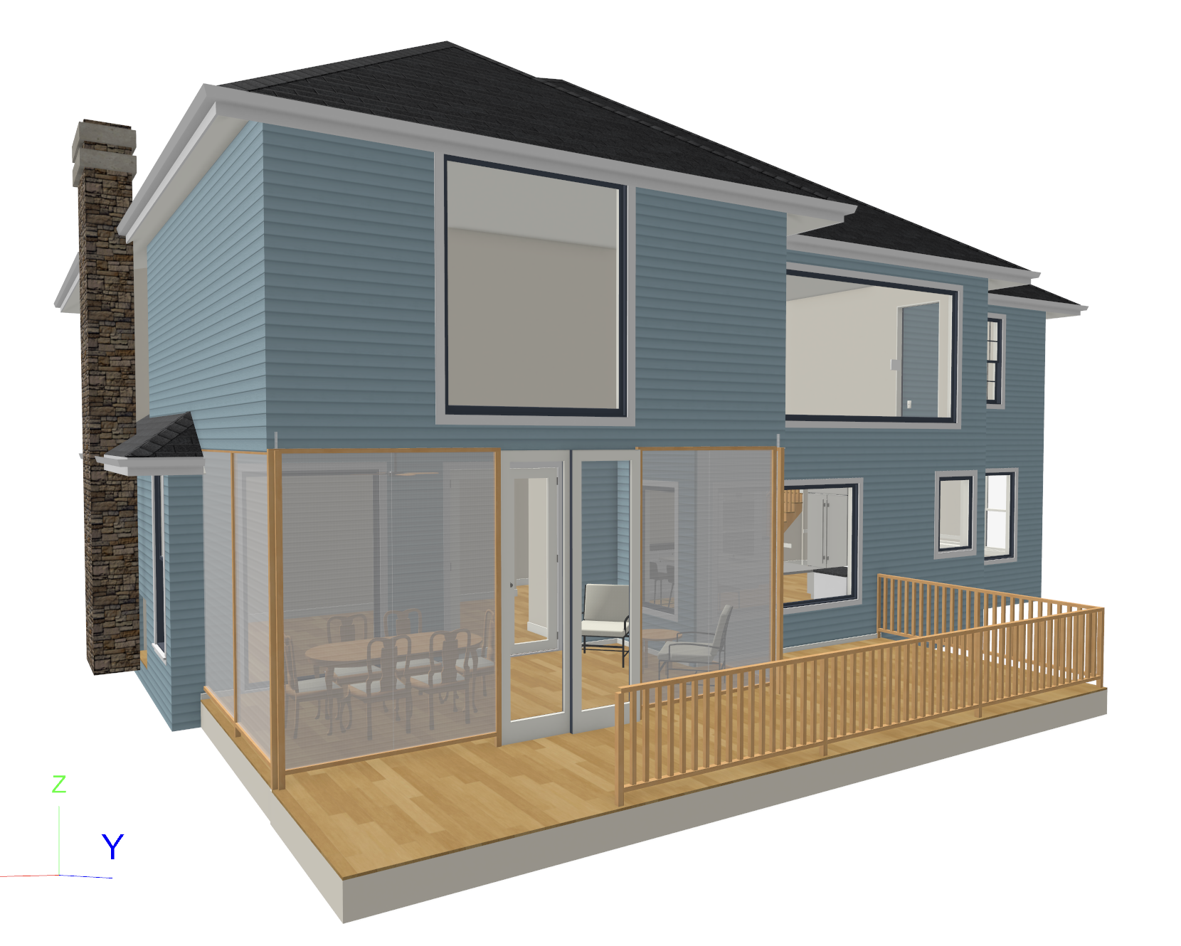 edit this screenshot to look like a high resolution 4k photorealistic photo it needs to have the look and fee of magazine photo you need to add greenery and nature around with pretty bushes blue sky and fluffy clouds seating lounge in the right corner of the open porch area change the wood floor color to darker wood and all window and door trim and of the screened in porch to white make the siding dusty blue but slightly darker roof can stay black upstairs window needs to show a tub and showerhead because it is a bathroom do not crop or change aspect ratio make all textures realistic and add shadows and light reflecting off of surfaces where needed