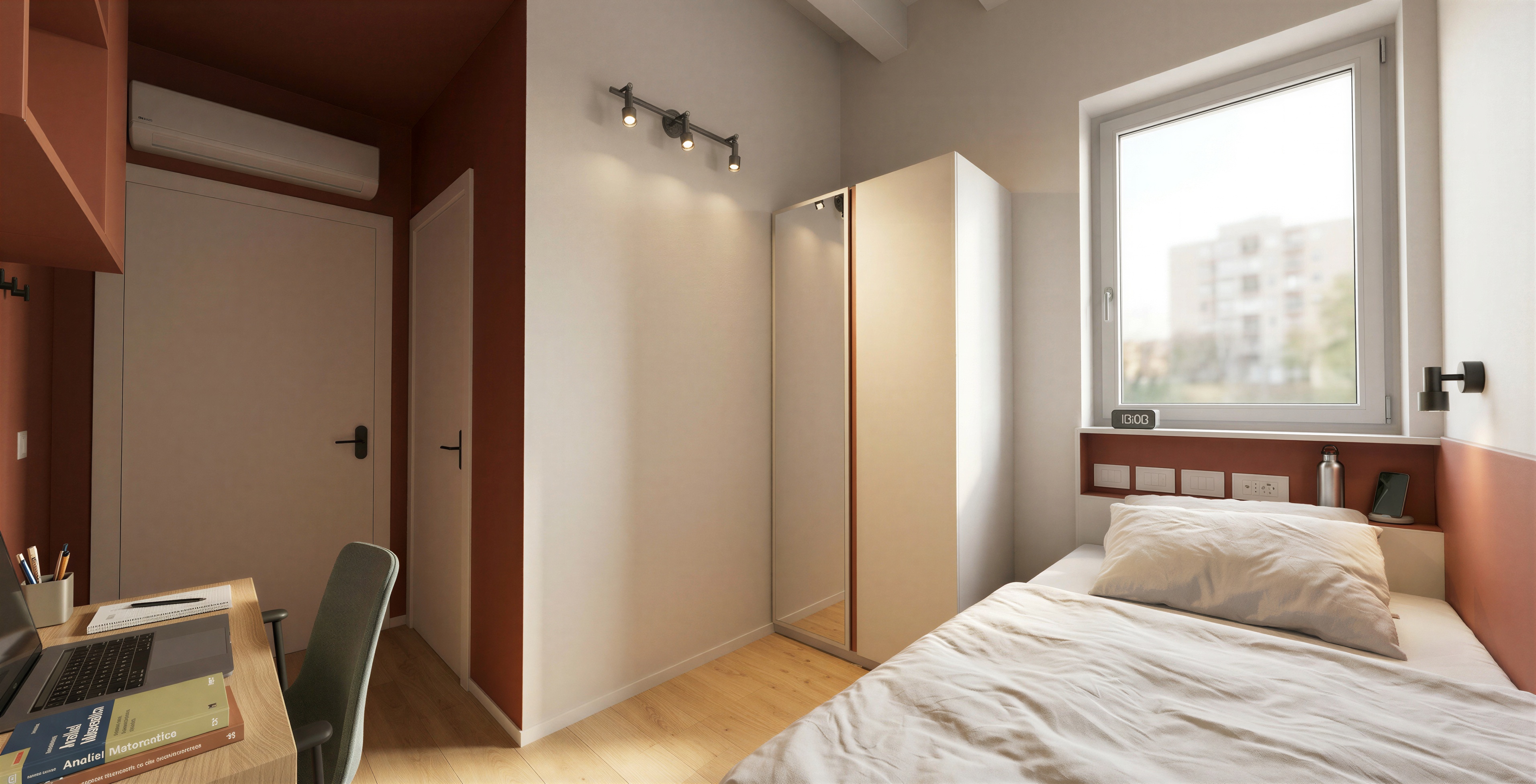 elimina finestra le travi che si intravedono a soffitto sono in legno bianco binario luci nero porte laccate bianche solo scocca sedia in plastica verde salvia arreda la stanza come uno studente universitario non attaccare nulla alle pareti