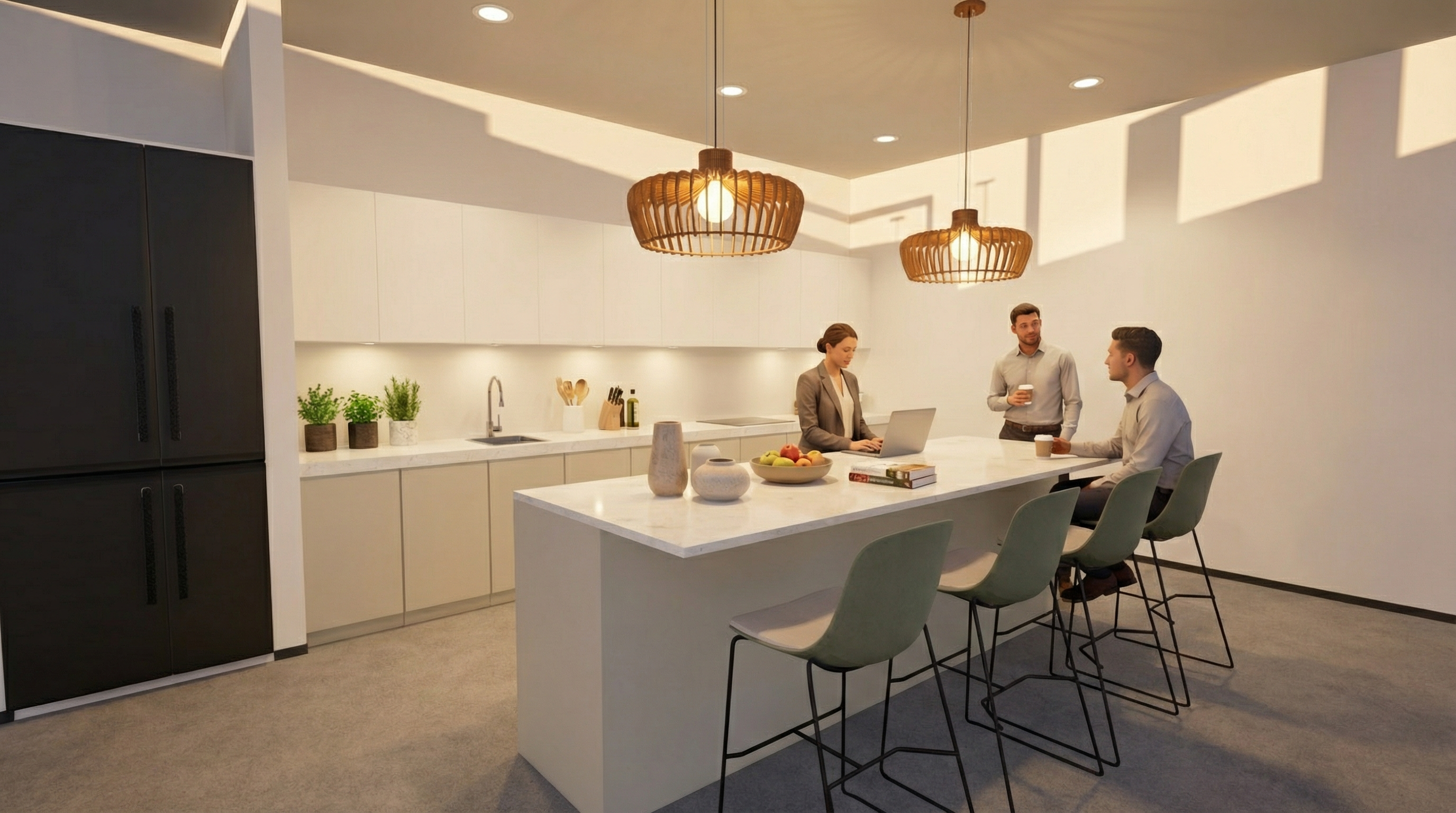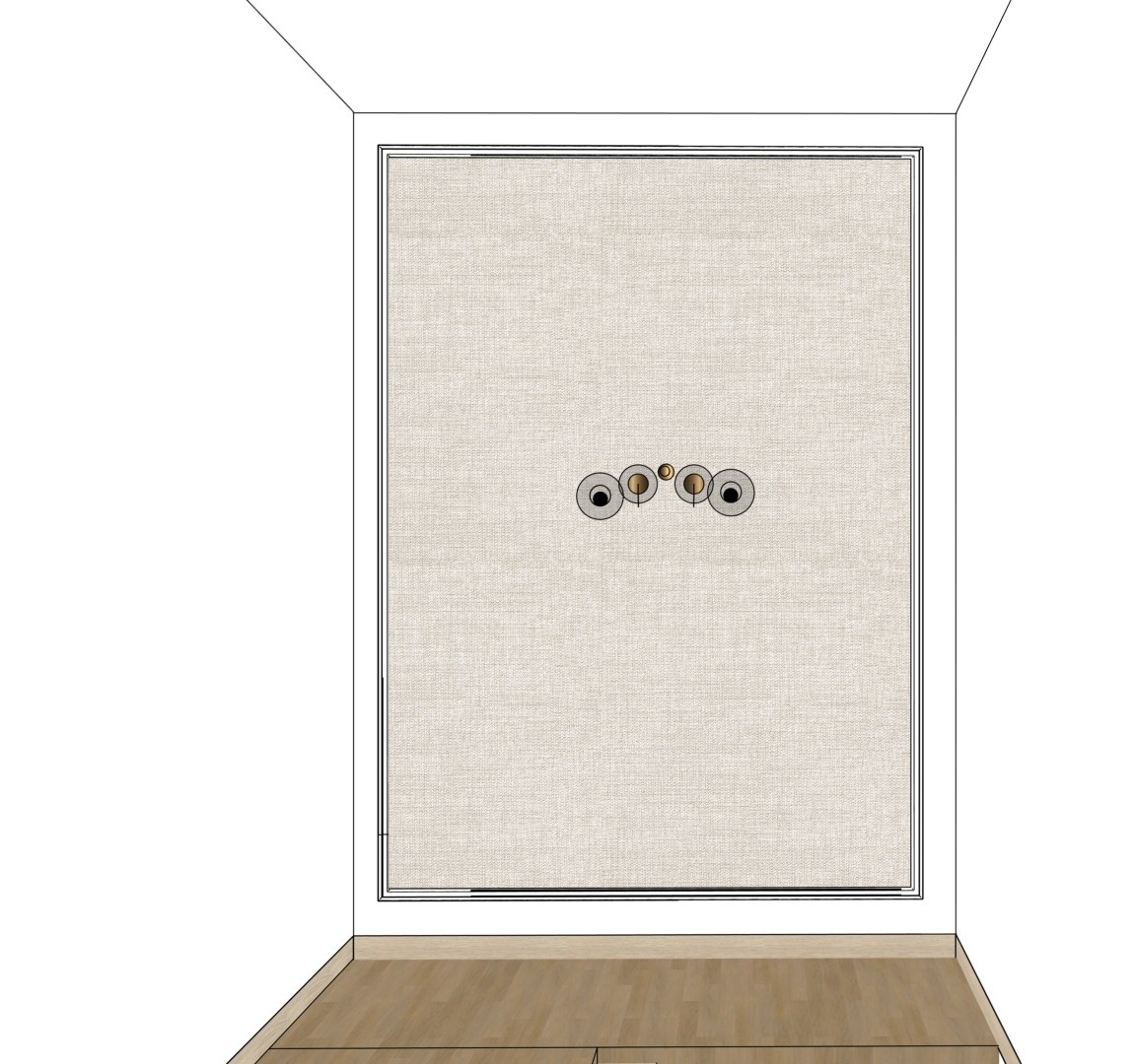 create a beautifully rendered image of a modern stairwell with natural oak wood steps and railing the wall features a textured beige fabric panel with subtle patterns adorned with abstract metal wall art in bronze silver and black the atmosphere is warm and inviting with soft ambient lighting casting gentle shadows the colors include light oak for the wood creamy beige for the wall and metallic hues for the art pieces