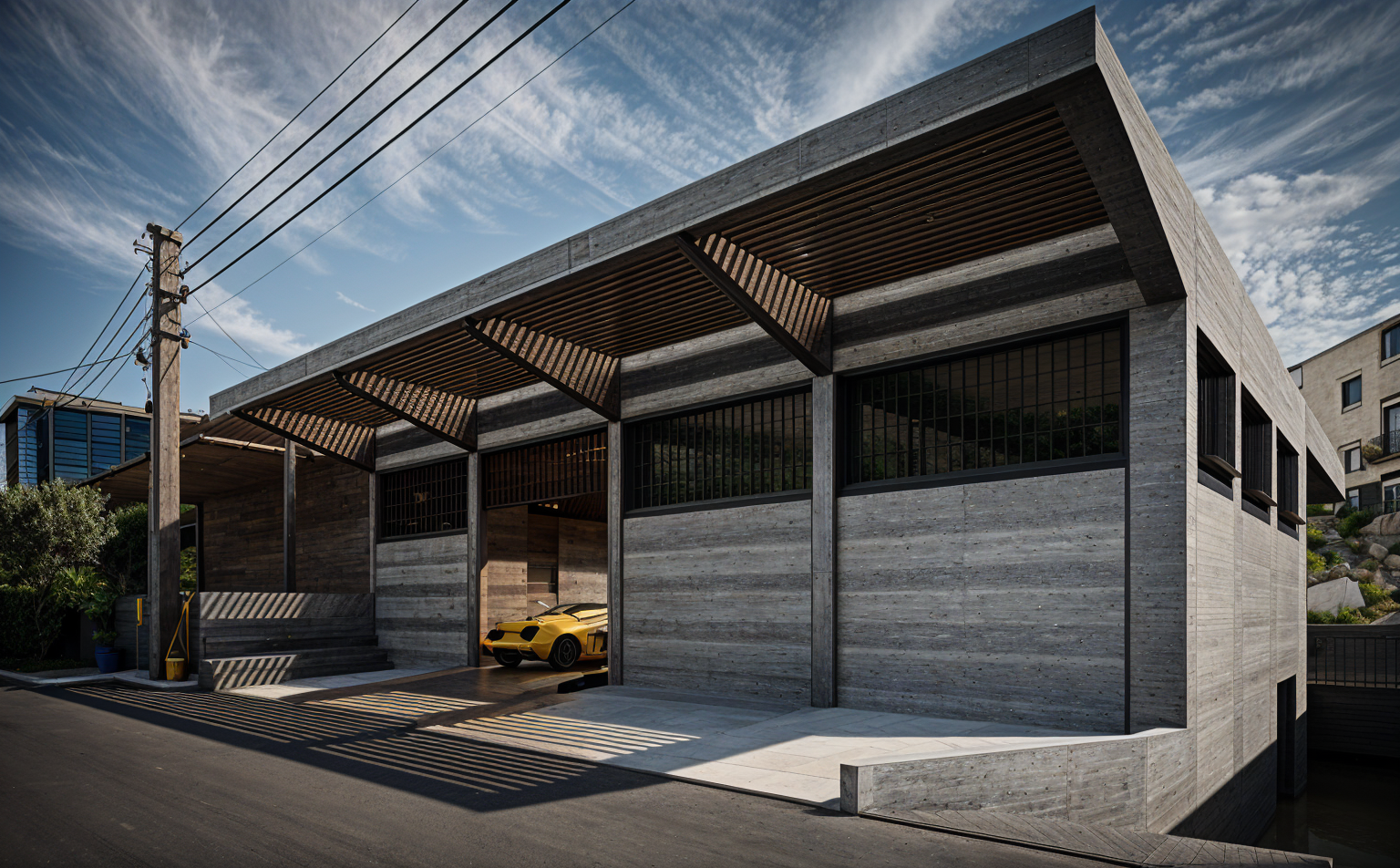 interior shot of open space living room with kitchen cozy atmosphere daylight scene with lighting on