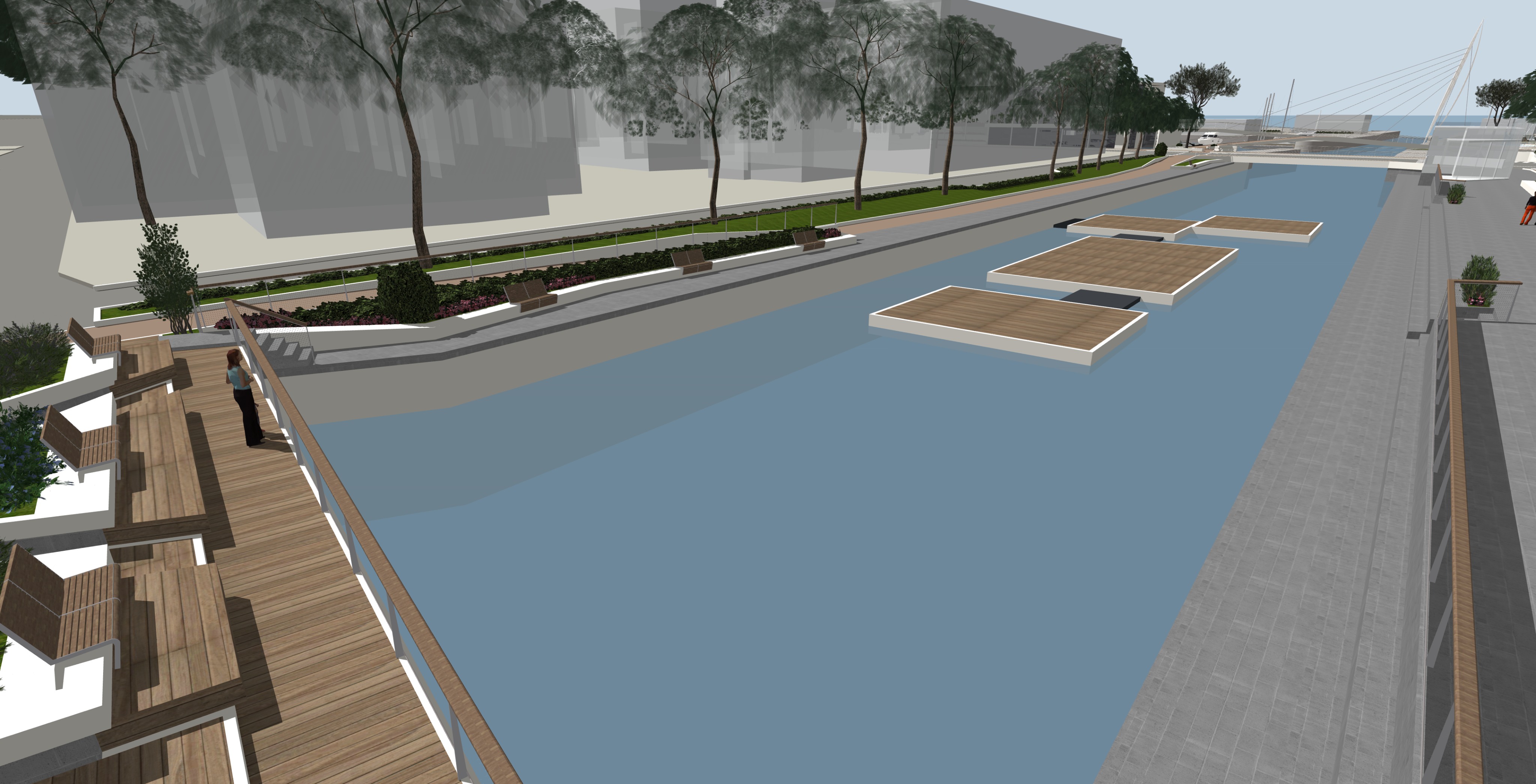 new street furniture on the river it s a warm summer night a band is playing on four floating platforms and numerous acrobats and jugglers are putting on a show many people are watching the show from both banks sitting on the steps and from the bridge enjoying themselves immensely the entire area is illuminated with atmospheric lighting keep the surrounding buildings abstract without adding windows doors decorations or other details